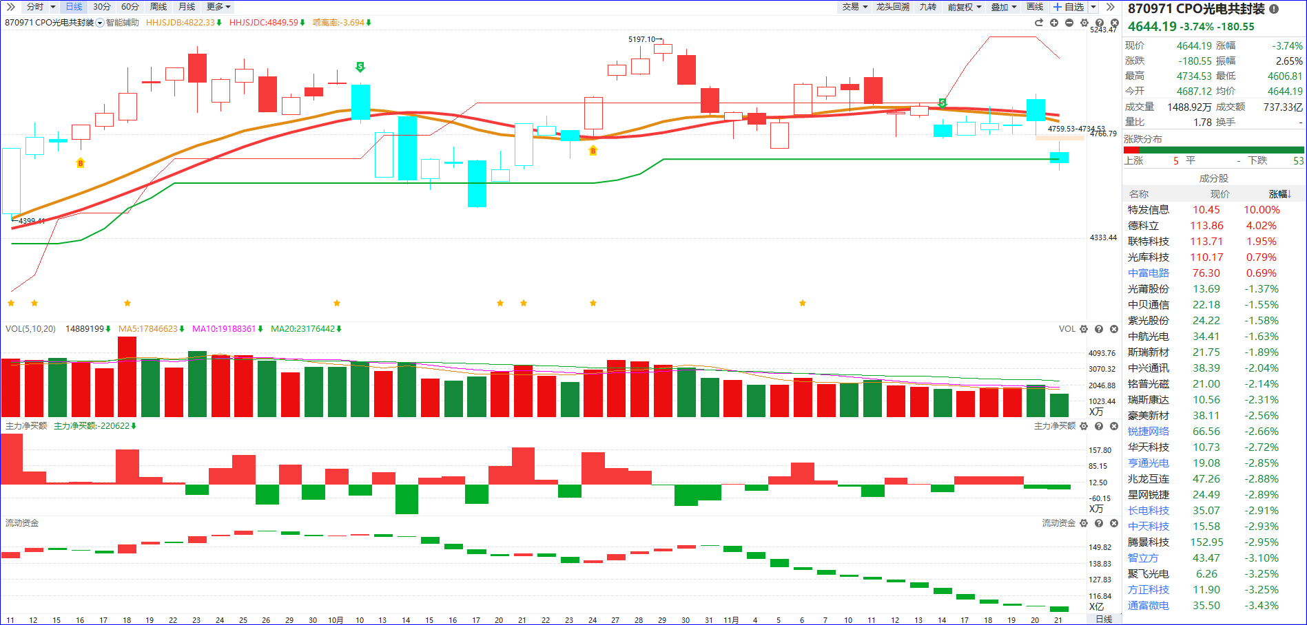 从软件信号看,近期CPO概念流动资金持续翻绿并刷新阶段低位,反映市场整体交投意愿仍处弱势区间;与之形成对比的是,主力净买额呈现红肥绿瘦,显示部分主力资金已开始尝试低位布局、进行抄底动作。不过从市场活跃度来看,当前板块尚未形成有效做多合力,尽管有主力资金试探性入场,但缺乏广泛资金跟投效应,整体交投热度仍显低迷。当前并非激进介入时机,更宜保持观望耐心,核心等待信号为流动资金出现持续翻红的明确拐点,待资金面与市场情绪形成共振后,再把握更具确定性的布局机会。