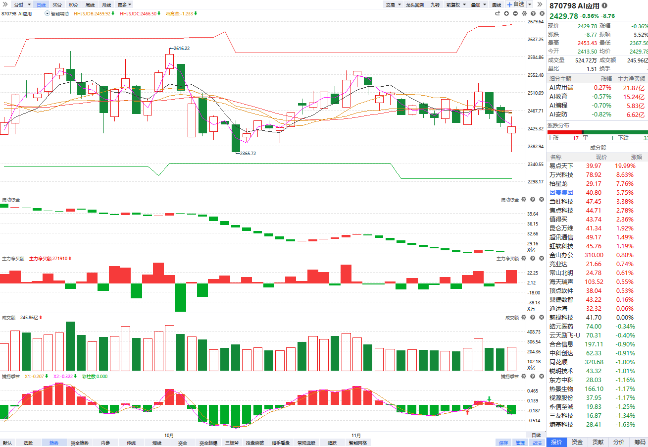 根据软件信号,板块近期流动资金持续翻绿创新低,短线反弹更多是消息催化下的超跌反抽,不具备太强的持续性,反弹到辅助线附近仍然容易承压回落,注意冲高后去弱留强收缩仓位。