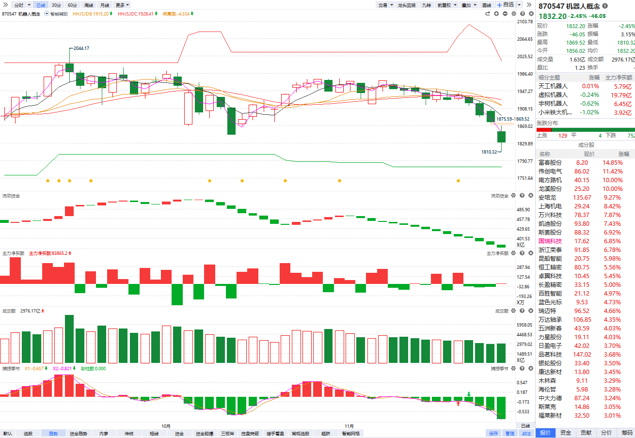 根据软件信号,板块近期流动资金持续翻绿创新低,主力净买额红肥绿瘦,虽然有主力资金尝试抄底进场,但整体活跃度还比较低,并未形成市场合力。日内探底回升走出大长腿走势,需要留意后续能否资金翻红站上辅助线,耐心等待资金和趋势走强的拐点。