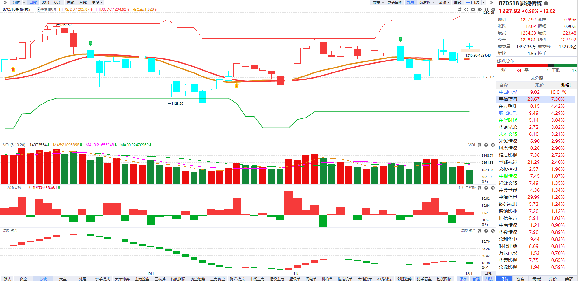 从软件信号看,影视传媒近期资金面表现相对疲软,流动资金持续翻绿,板块整体围绕智能辅助线展开震荡整理,尚未形成明确的趋势方向,市场情绪偏向谨慎。当前需将关注点集中于板块资金面能否快速回暖并实现净流入翻红:若资金端依旧维持弱势、未出现实质性改善,则意味着近期板块的局部异动,更多是消息面短期催化下的一日游反抽行情,这类行情缺乏持续的资金支撑,整体不具备太强的趋势延续性。