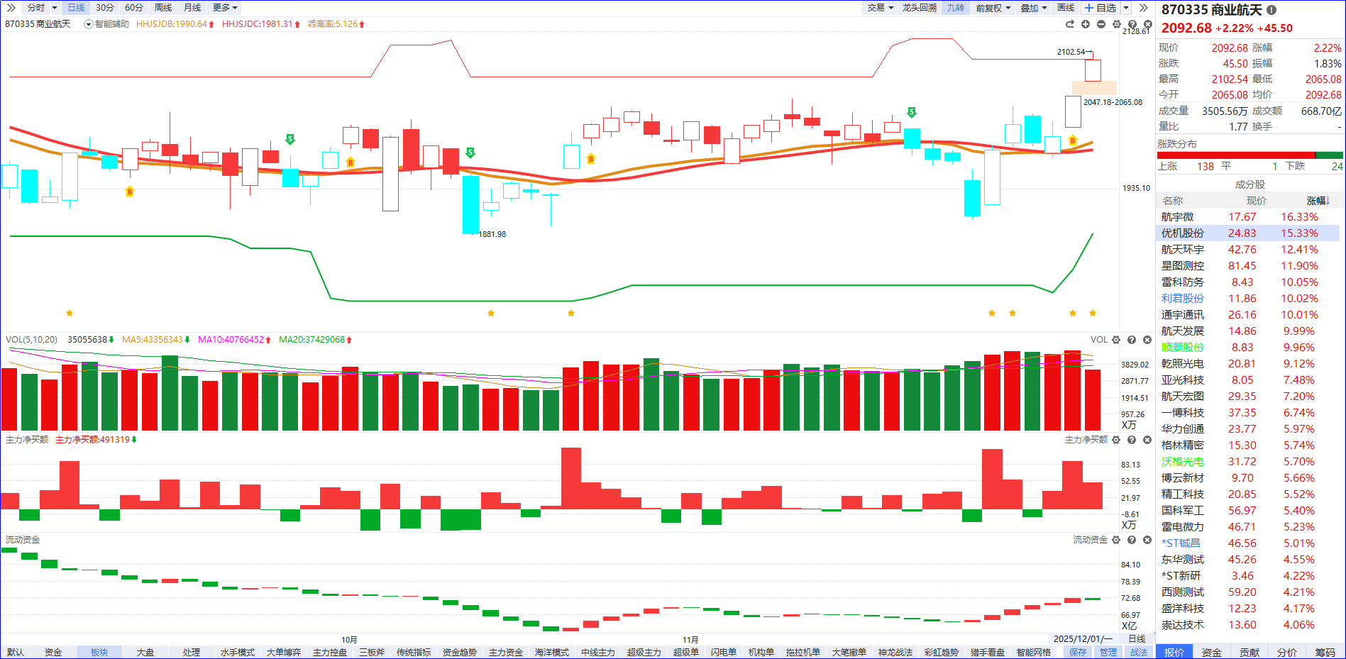 从软件信号看,商业航天近期流动资金持续翻红,主力净买额红肥绿瘦,资金做多意愿清晰。今日板块以放量形态突破前期横盘整理平台,资金动能与技术趋势形成强势共振。从有效性验证角度看,若日内能稳固当前强势态势、未出现显著回落,此次平台突破的有效性将得到进一步确认。基于当前市场特征,后续操作可聚焦5日内主力资金排序靠前的标的,当这类标的首次出现缩量回踩5日均线附近时,将具备较高的回档博弈性价比。