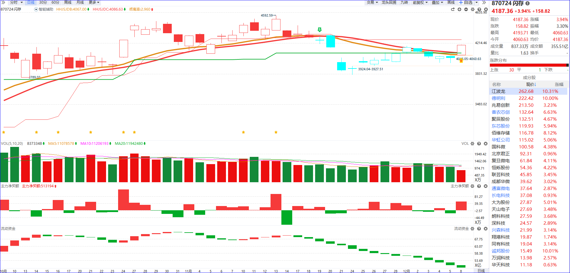 从软件信号看,存储芯片近期流动资金延续以翻绿为主的弱势格局,尽管主力净买额呈现红肥绿瘦的积极信号,但整体资金活跃度始尚未激活,没能形成有效市场合力。若后续流动资金未能快速翻红,仍面临再度分化的风险,操作上需警惕高位冲高诱惑,回避盲目追涨行为,保持谨慎布局节奏。