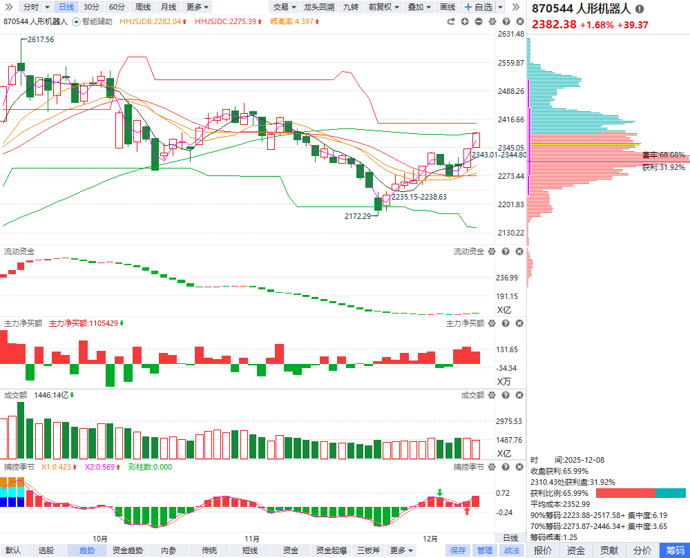 根据软件信号,板块近期流动资金持续翻绿新低,主力净买额红肥绿瘦,出现主力资金进场但整体资金活跃度较低,还未形成市场合力。捕捞季节走出底背离的修复结构,金叉后再度站上辅助线,如果流动资金能够快速翻红,日线金叉初期可以积极关注60分钟回档的性价比博弈节点。