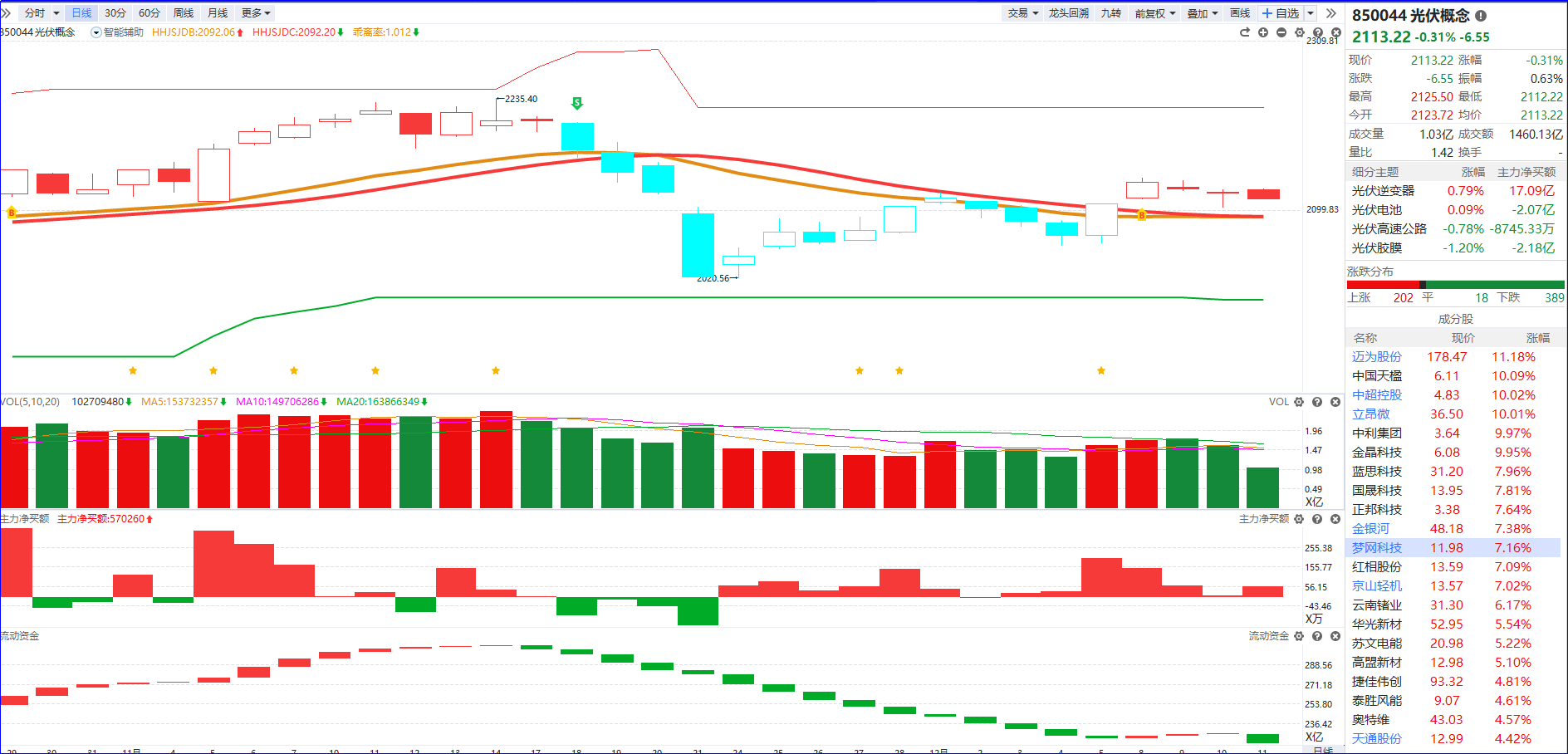 从软件信号看,光伏板块近期流动资金持续翻绿,但主力净买额红肥绿瘦,多空博弈态势凸显。板块经历超跌反弹后成功站上辅助线,不过随即进入缩量回档阶段。当前核心关注点在于量能补位情况,若后续缺乏增量资金进场支撑,缩量回档过程中极易引发板块再次分化走弱。操作层面需保持谨慎,回避盲目冲高追涨,耐心等待资金面出现明确拐点(如流动资金由绿转红、量能有效放大)后再择机布局。