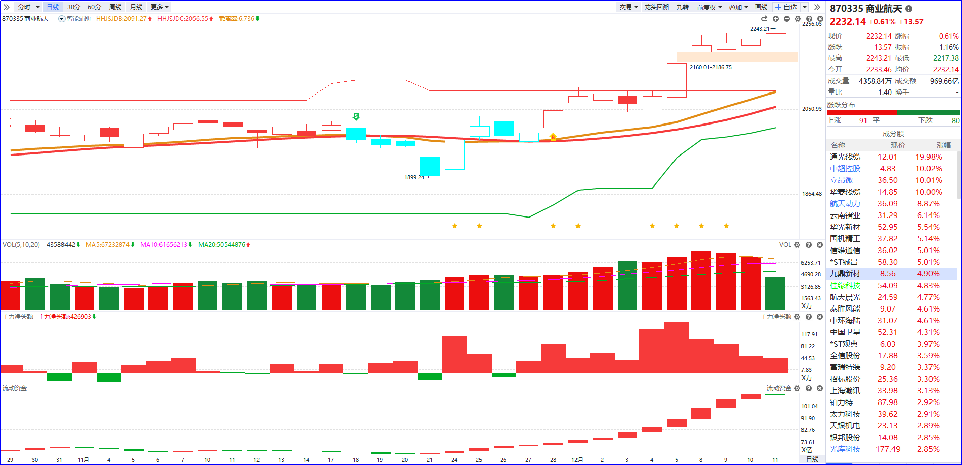 今日上午商业航天概念反复走强,再升科技4连板,华菱线缆、四川金顶涨停,中超控股、广联航空、鸿远电子、天力复合跟涨。
