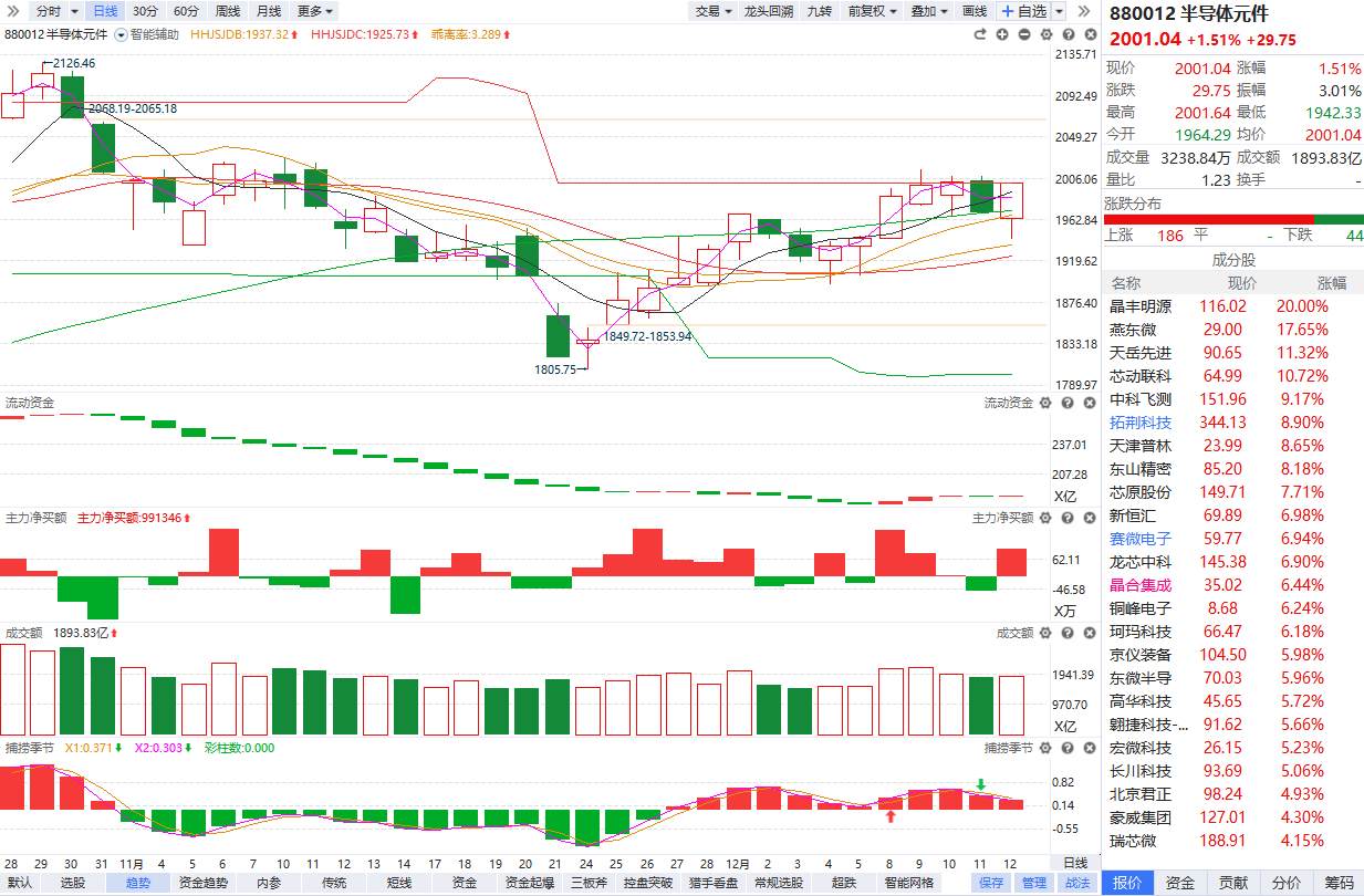 根据软件信号,板块近期流动资金持续翻红,主力净买额红肥绿瘦,资金强势背景下放量突破横盘平台,有望形成沿着5日线震荡上行的上涨趋势,死叉震荡3-4个交易日后具备反弹预期。