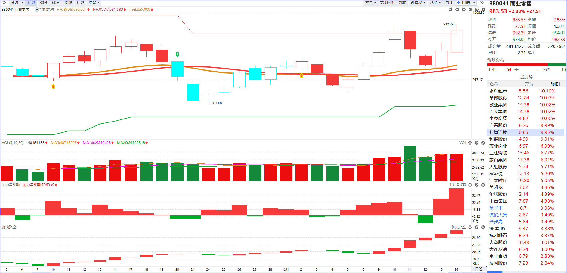 从软件信号看,零售板块近期流动资金持续翻红,主力净买额红肥绿瘦。板块在首次回踩智能辅助线后迅速企稳反弹,若后续流动资金与主力净买额能延续翻红态势,有望构建沿5日均线震荡上行的强势格局。操作上把握板块缩量回踩5日线时的分歧博弈机会。