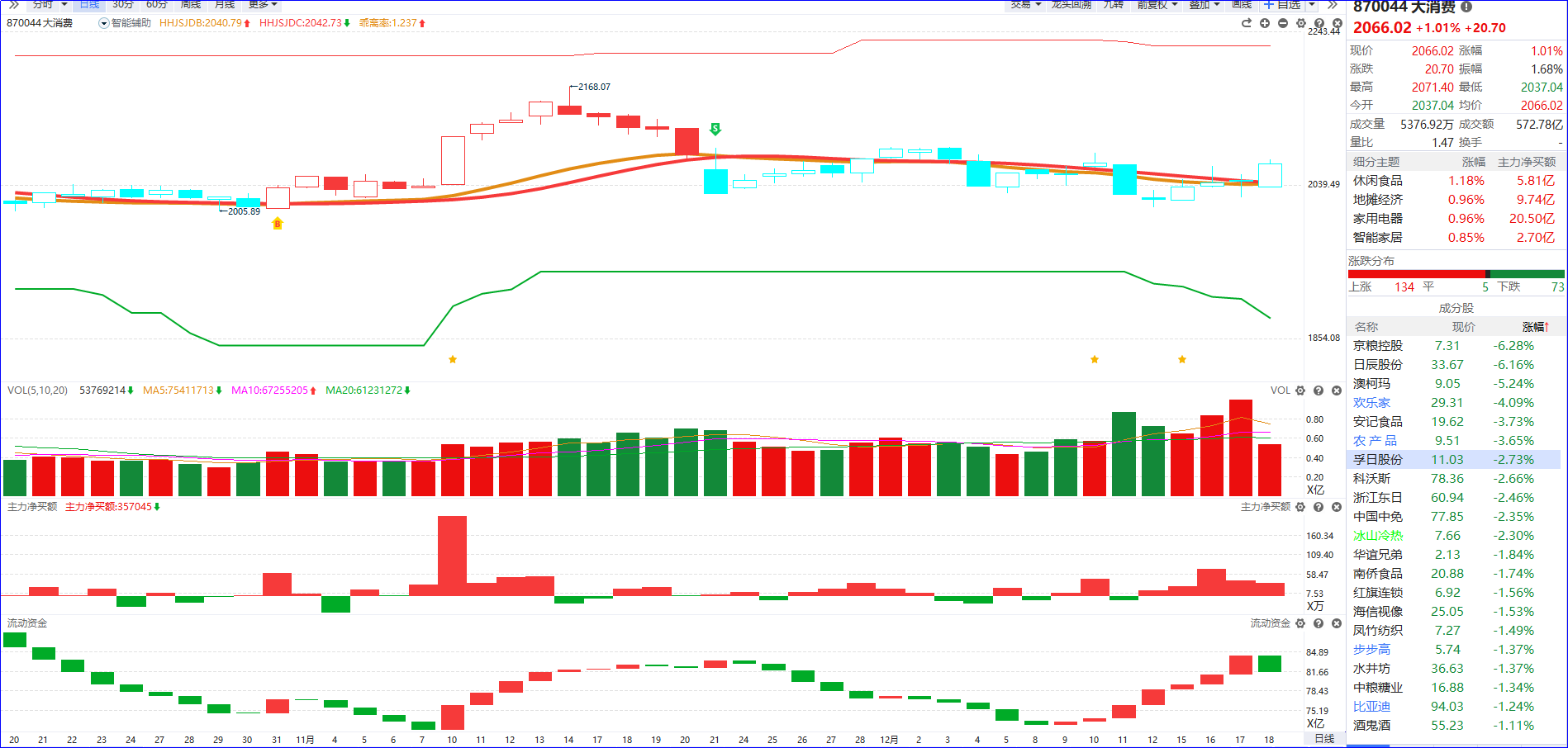 从软件信号看,大消费近期呈现明确资金强势信号:流动资金持续翻红,主力净买额呈现红肥绿瘦格局,资金合力推动下板块放量站上辅助线。若后续资金强度延续,首次缩量回档将具备高博弈性价比,可重点关注5 日主力排序靠前+流动资金持续翻红的活跃个股,把握上升回档中的布局机会。