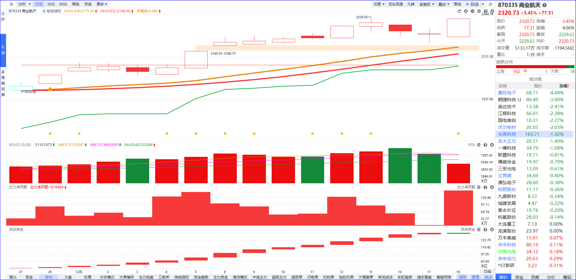 从软件信号看,商业航天近期流动资金持续翻红,主力净买额红多绿少,在资金支撑下板块缩量回踩后走出回档金叉反弹行情。当前反弹已临近前期高点形成的压力平台,需警惕高位追涨风险;若后续能以放量形式突破该压力平台,可等待突破后的首次缩量回档机会,进行博弈布局更具安全性。