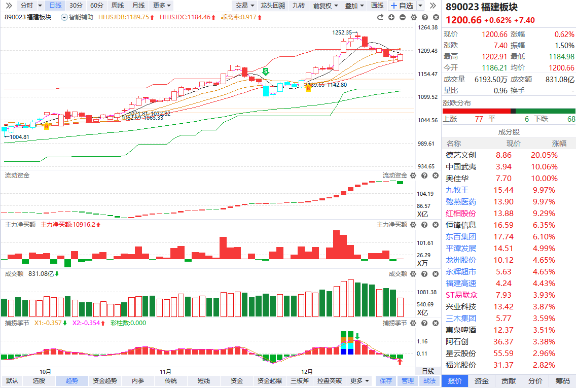 根据软件信号,板块近期流动资金持续翻红,主力净买额红肥绿瘦,资金强势背景下缩量回踩辅助线走出回档金叉反弹,如果资金能持续翻红,可以留意日线金叉初期的60分钟回档博弈 不过需要注意福建板块从启动至今已经经历两轮大级别的炒作行情,资金已经深度介入,获利盘较多且筹码拥挤的情况下容易快速轮动,只适合快进快出的超短线博弈。
