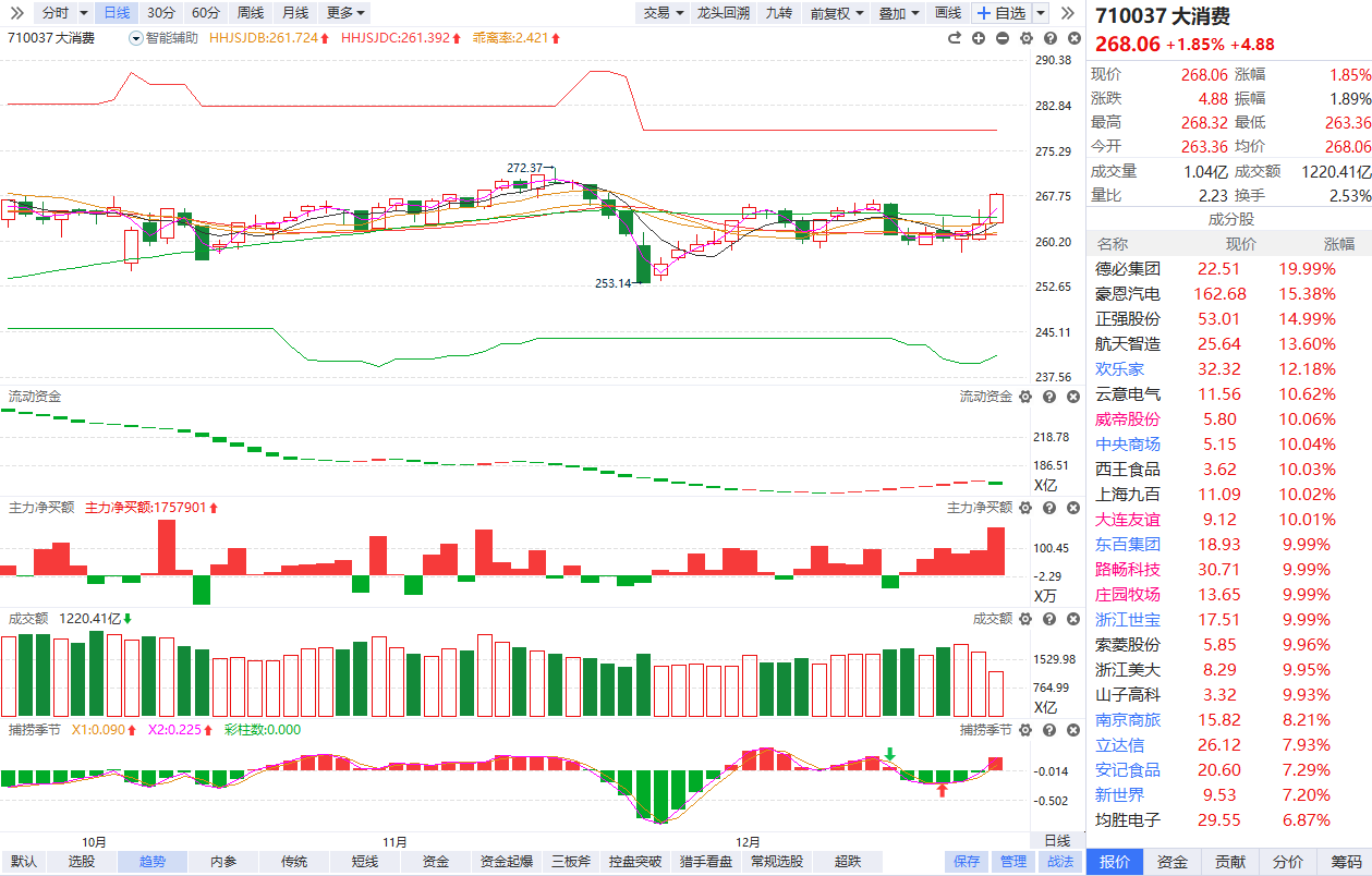 大消费板块持续走高,零售、食品饮料、犒赏经济等方向均表现不俗,德必集团、大连友谊、西王食品、东百集团涨停,此前三湘印象2连板,天创时尚、中央商场、上海九百等涨停。
