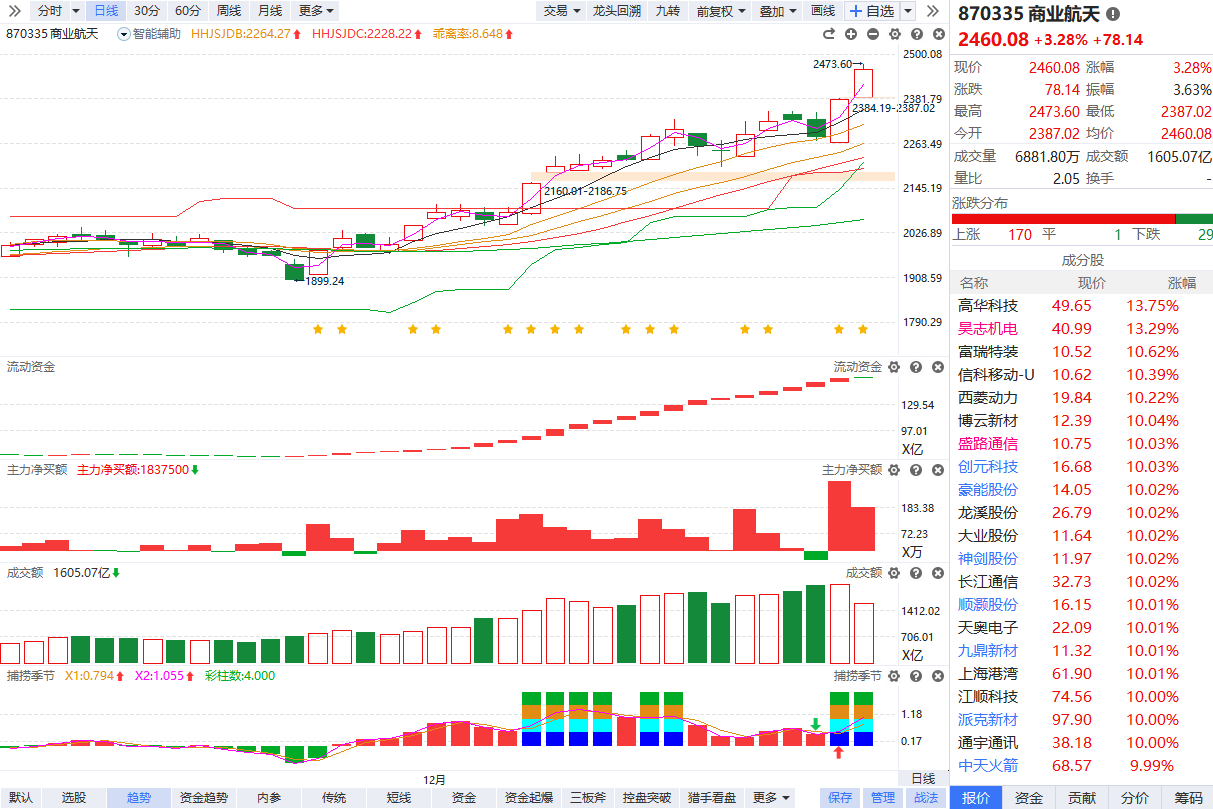 根据软件信号,板块近期流动资金持续翻红,主力净买额红肥绿瘦,放量突破前期横盘平台后有望启动新一轮上行趋势,只要资金继续维持强势,缩量回踩5日线的60分钟回档节点,可以积极关注核心前排的分歧换手博弈。