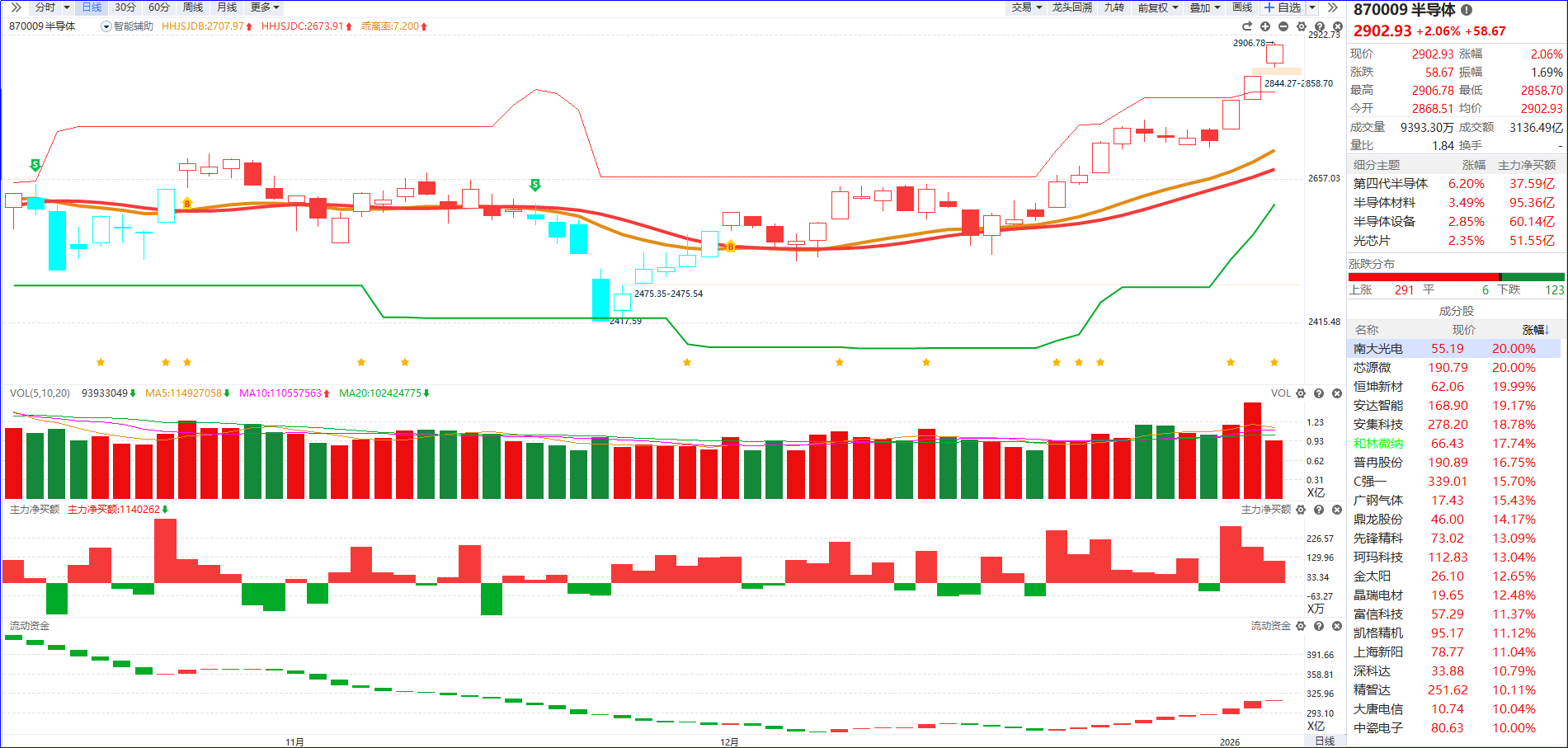 从软件信号看,半导体近期表现强势,流动资金持续翻红,主力净买额红肥绿瘦。经历前期上升趋势后的震荡整理,当前板块拉升态势已显现再度强化的迹象,且板块内部股价阶段新高的个股数量持续增多。后续操作可聚焦5日主力资金排序靠前的标的,重点筛选流动资金持续翻红、同时主力控盘度稳步递增的强势个股进行布局。
