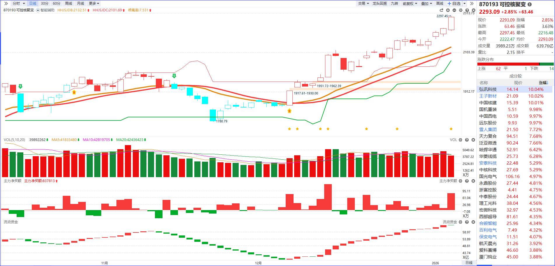 从软件信号看,核聚变近期流动资金持续翻红,主力净买额红肥绿瘦。在震荡上行的趋势基调下,今日板块再度迎来中大阳线拉升,趋势强度与资金承接力同步增强。后续展望,若板块能维持流动资金持续翻红的良性状态,可重点聚焦5日主力资金排序靠前的标的,核心关注缩量回踩5日线或智能辅助线后,再度启动的布局机会。