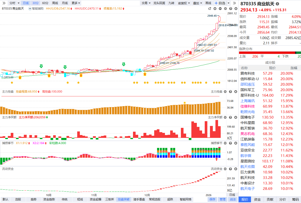 市场早盘震荡走强,沪指高开高走站上4100点,深成指涨超1%。成交量方面,量能持续放大,第一个小时两市放量1595亿元,预计全天成交超3万亿。当前整体涨多跌少,上涨个股超3500家。市场情绪高涨,封板率一度接近八成。热点延续轮动,商业航天概念持续爆发,二十余只成分股涨停,鲁信创投11天9板,航天电子6天4板。可控核聚变概念延续强势,弘讯科技、中国一重双双3连板。