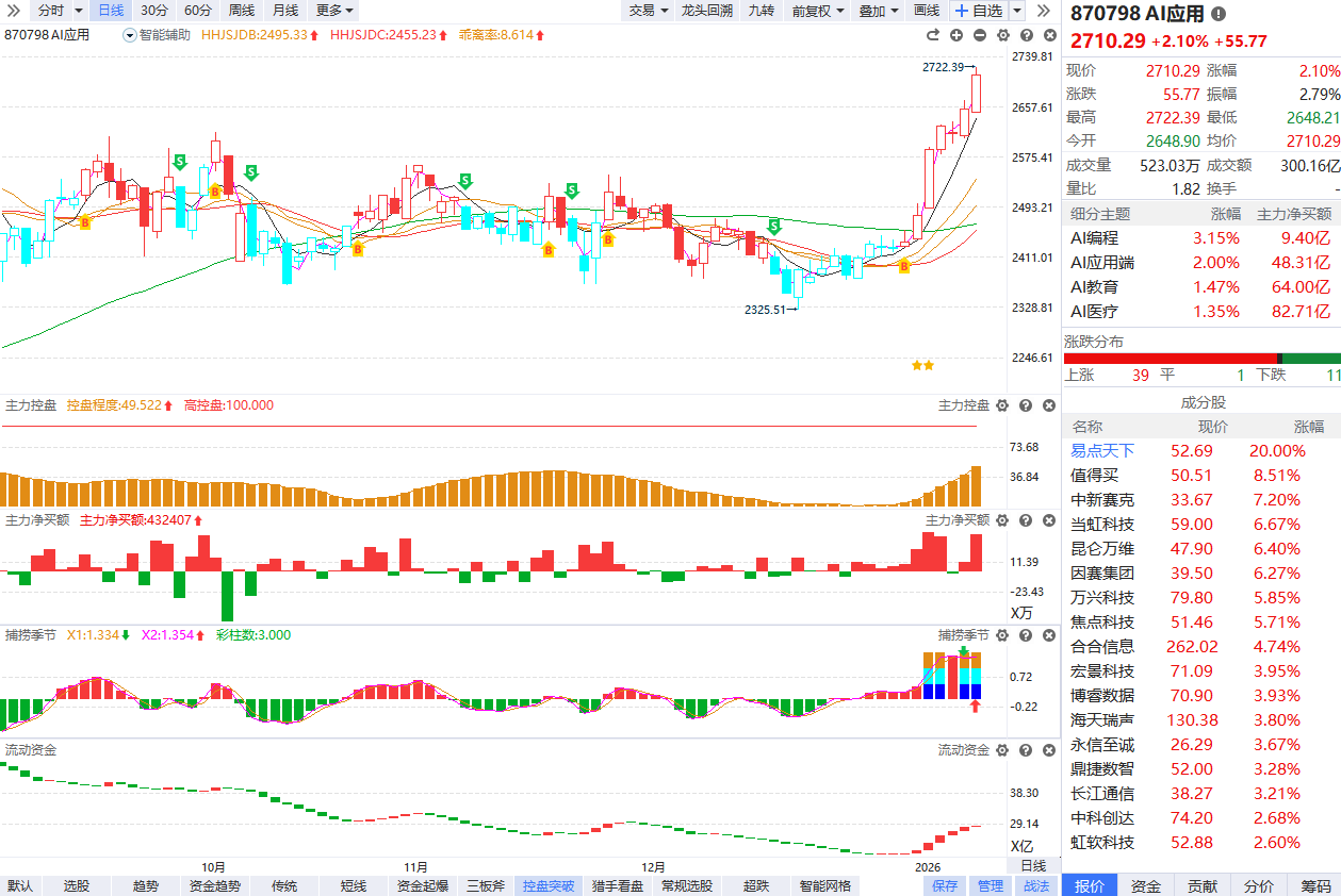 早盘AI应用端持续拉升,AI营销、AI医疗方向领涨,易点天下、省广集团触及涨停,此前迪安诊断、利欧股份、引力传媒、美年健康涨停,天龙集团、创业慧康涨超10%。