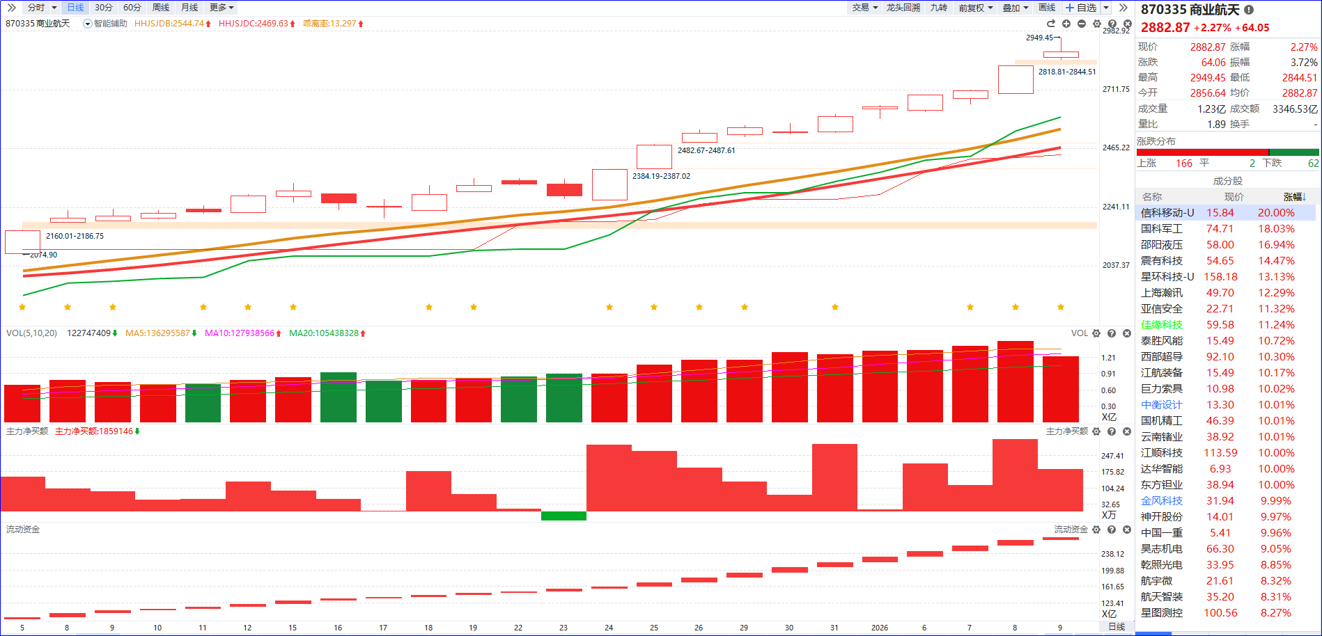 从软件信号来看,商业航天板块近期表现亮眼,流动资金持续翻红,主力净买入额呈现红肥绿瘦,已然成为当前市场最核心的热门主线。作为资金介入深度最深的板块,该方向具备极强的活跃惯性,后续有望延续较长周期的活跃态势,个股活跃度大概率维持高位。只要高位股未出现集体退潮的明确信号,短线题材炒作的热度大概率将持续。