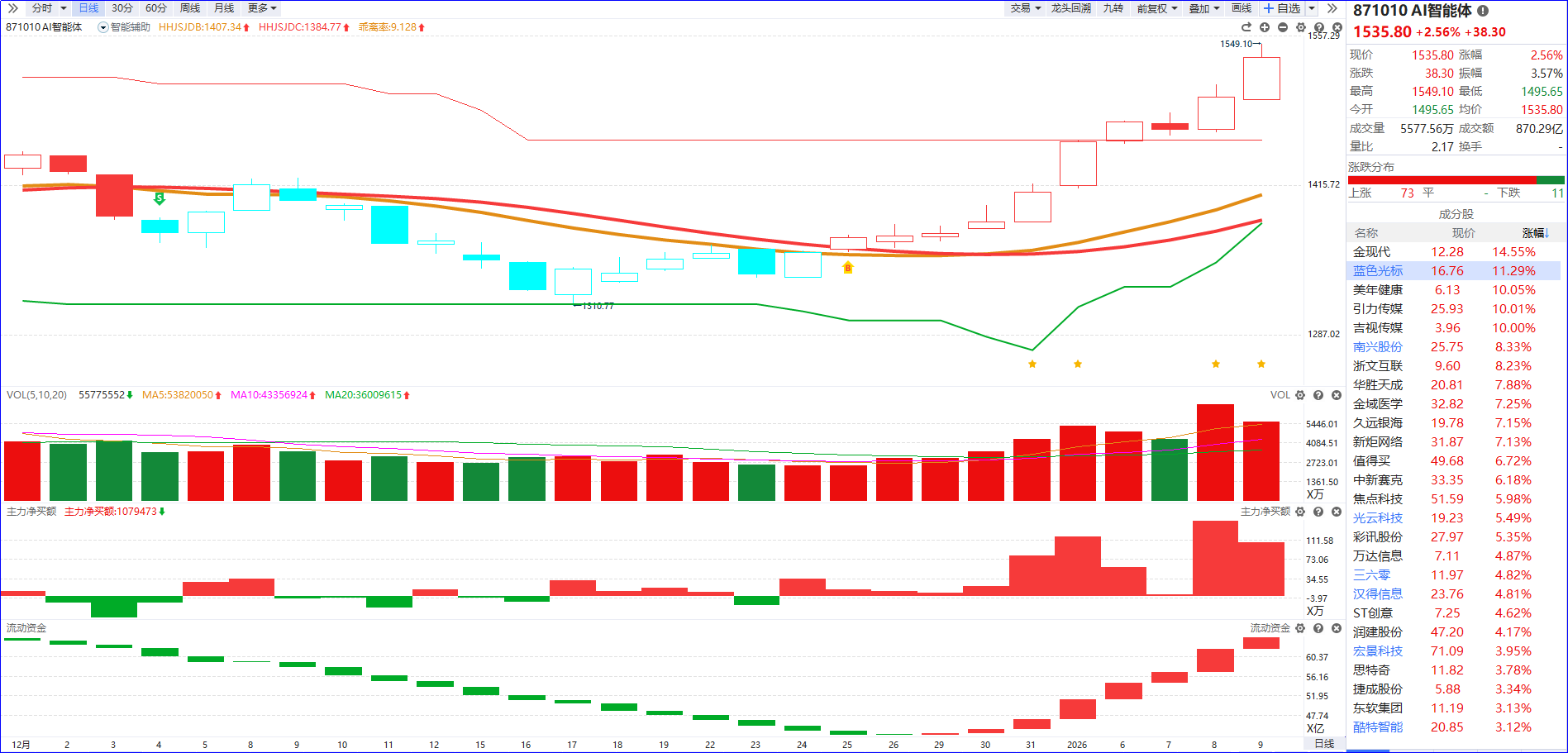 从软件信号来看,AI智能体近期流动资金以翻红为主,主力净买入额红柱显著放大。今日该板块再度迎来爆发,板块中军标的蓝色光标涨幅超10%,有效带动板块热度攀升。后续操作可聚焦5日主力排序靠前、主力控盘递增的个股,把握上升回档的布局机会。