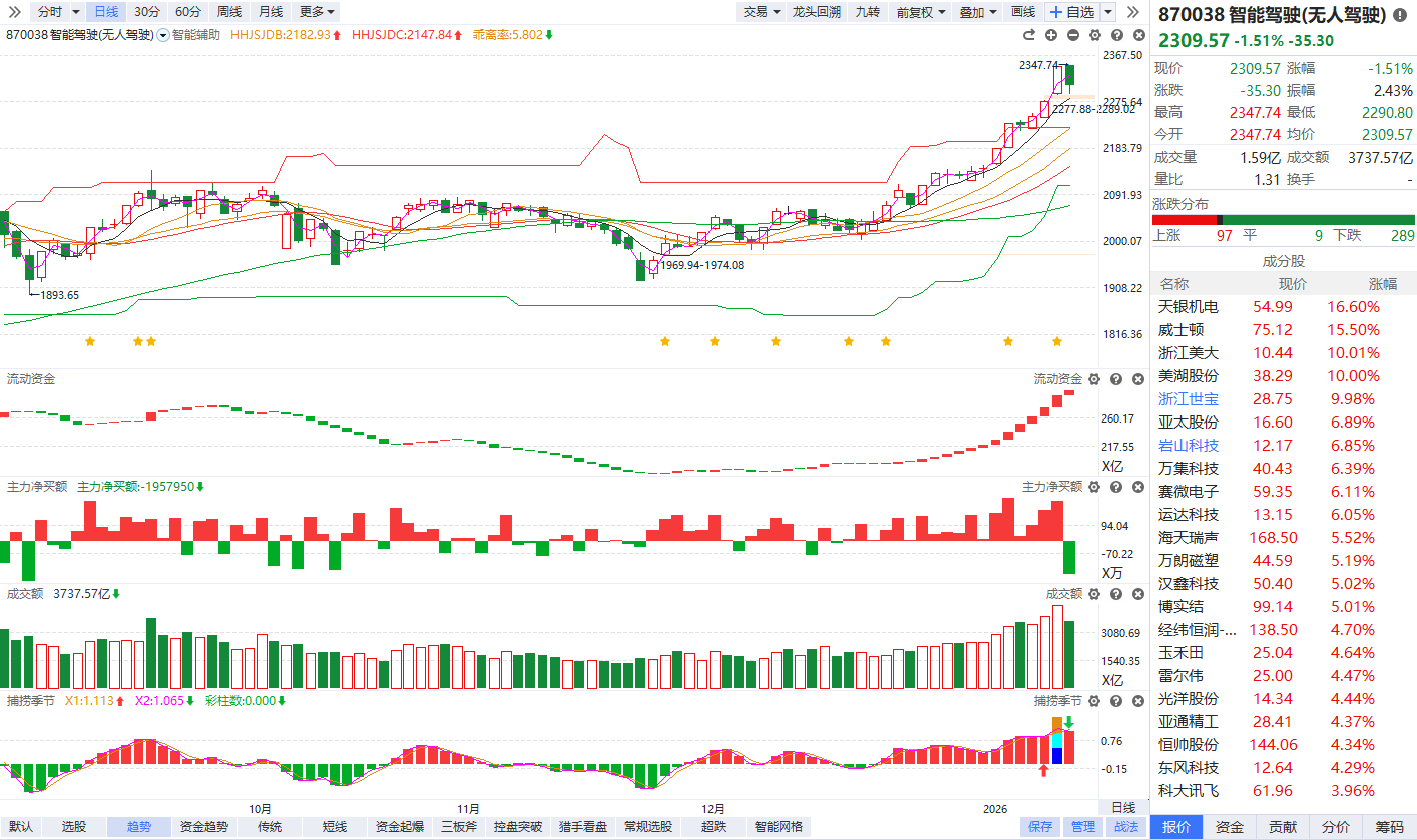 午后智能驾驶概念逆势走强,浙江世宝涨停,亚太股份、雷尔伟、索菱股份、汉鑫科技等冲高。