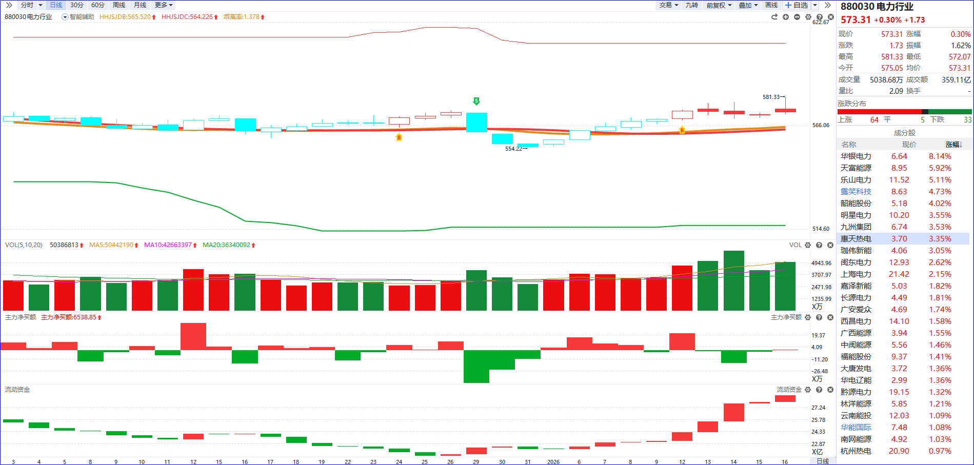 从软件信号看,电力板块近期流动资金维持翻红,但主力净买额红绿交替、力度均衡,K线整体处于震荡整理区间。今日该方向异动受消息面催化,同时具备一定防御属性,若后续主力净买额红柱未能有效放大、力度始终偏弱,则此方向行情的延续性仍需谨慎观察,不确定性较高。