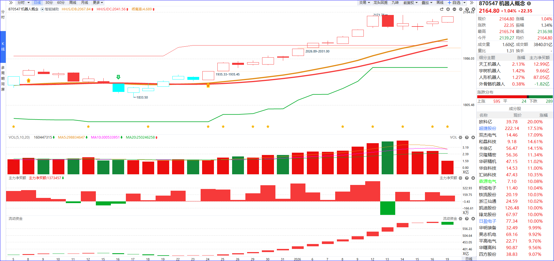 从软件信号看,机器人近期流动资金同样维持翻红,主力净买额呈现红肥绿瘦,K线走势震荡上行。该板块短期为前期主线退潮后,市场资金轮动的核心选择之一;在板块内5日主力资金排序靠前的标的中,优先关注流动资金持续翻红,或主力控盘程度稳步递增的个股,这类标的具备更强的走势持续性。