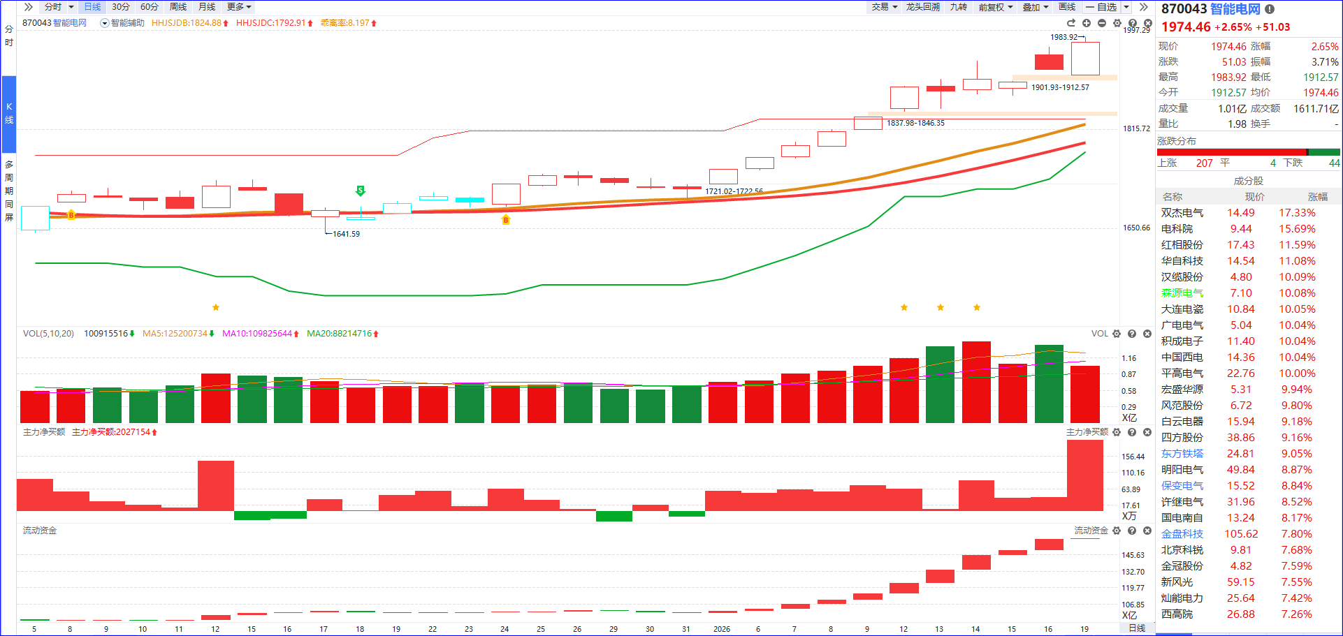 从软件信号看,智能电网近期流动资金持续翻红,主力净买额今日录得阶段性新高,K线走势呈现阳包阴形态,板块趋势与资金面形成同步走强格局。今日该板块涨停家数位居市场前列,板块整体活跃度显著提升,后续可重点跟踪板块内5日主力资金排序靠前、且主力控盘程度逐步递增的标的。