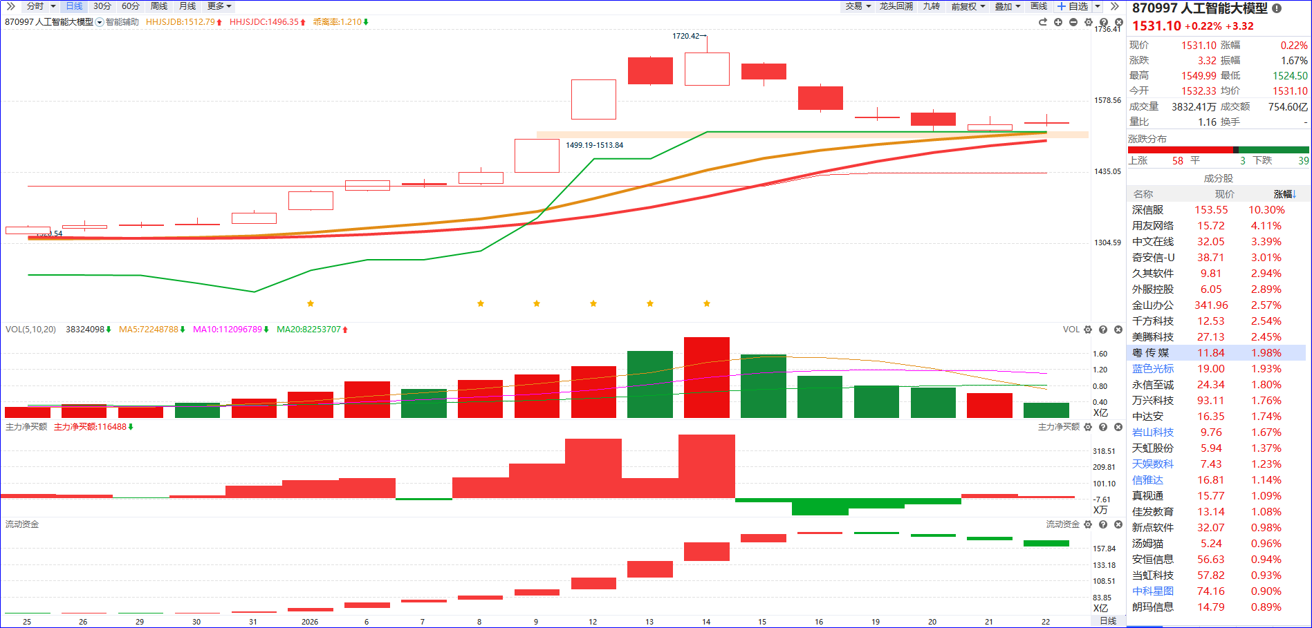 从软件信号看,AI应用板块近期流动资金持续翻绿,主力资金净买入额呈现绿肥红瘦,整体资金面表现偏弱。在经历连续调整后,板块于智能辅助线附近触发反弹,但反弹力度较为温和。从板块内部结构看,反弹动能主要集中于基本面质地优良的个股,若后续流动资金无法实现持续翻红,短期板块大概率再度陷入内部分化格局。