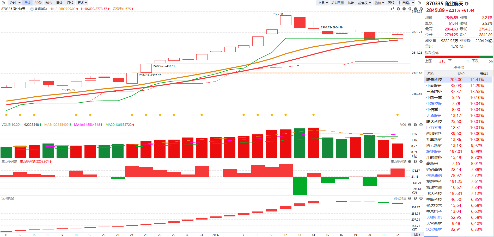 从软件信号看,商业航天板块近期同样流动资金持续翻绿,资金面相对疲软。经过多日调整后,板块在智能辅助线附近迎来反弹,不过行情仅表现为局部个股活跃,反弹动能主要集中于基本面质地优良的个股。后续若流动资金未能扭转颓势、实现持续翻红,短期板块内部分化风险仍将上升。