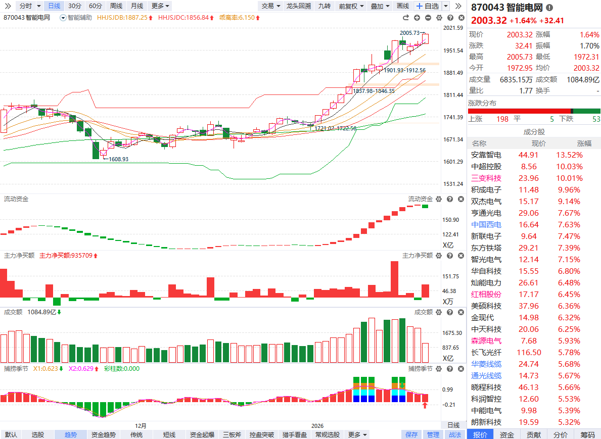 根据软件信号,板块近期流动资金连续翻红,主力净买额红肥绿瘦,资金持续走强,捕捞季节走出回档金叉反弹,资金强势背景下有望走出沿着5日线持续上行的金叉波段,日线金叉初期的60分钟回档可以积极关注性价比博弈机会。