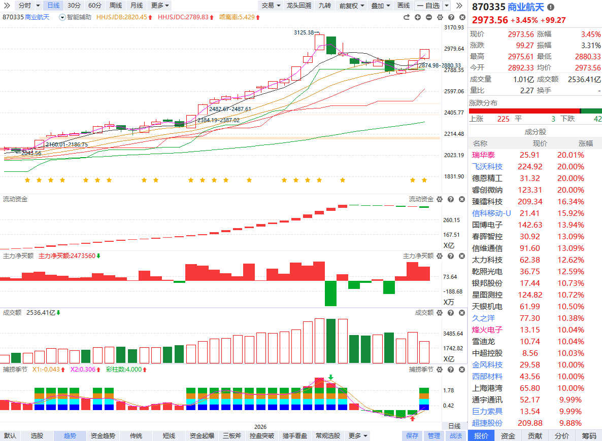 早盘商业航天概念延续强势,巨力索具3连板,中超控股2连板,德恩精工、睿创微纳涨超10%,飞沃科技、信科移动、金风科技、烽火通信冲高。