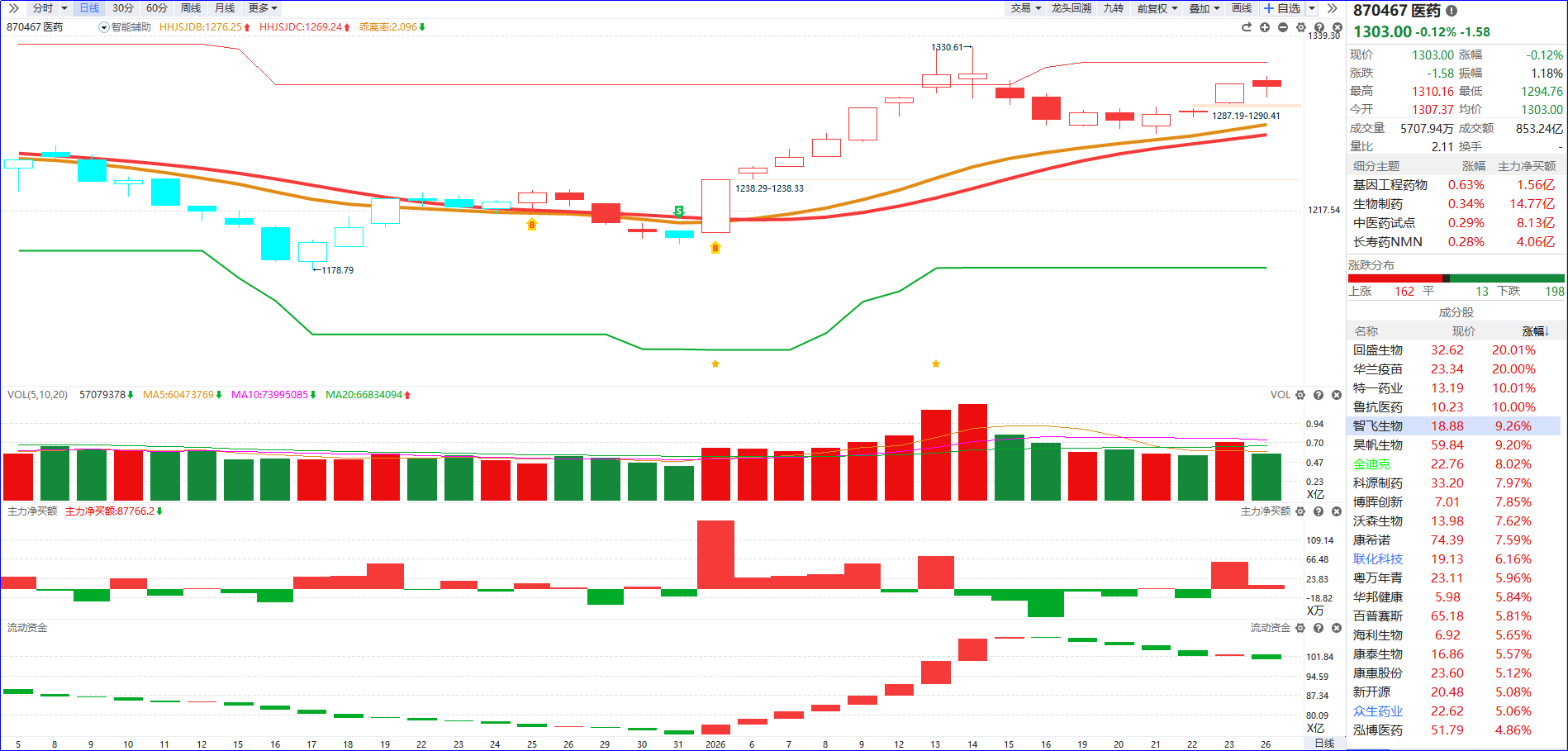从软件信号看,医药板块近期流动资金持续翻绿,主力净买额绿肥红瘦,K线走势维持震荡整理态势。股价在短期回踩智能辅助线后触发弱反弹,但反弹至前期高点附近时,易面临压力并出现走势分化,上行动能相对乏力。