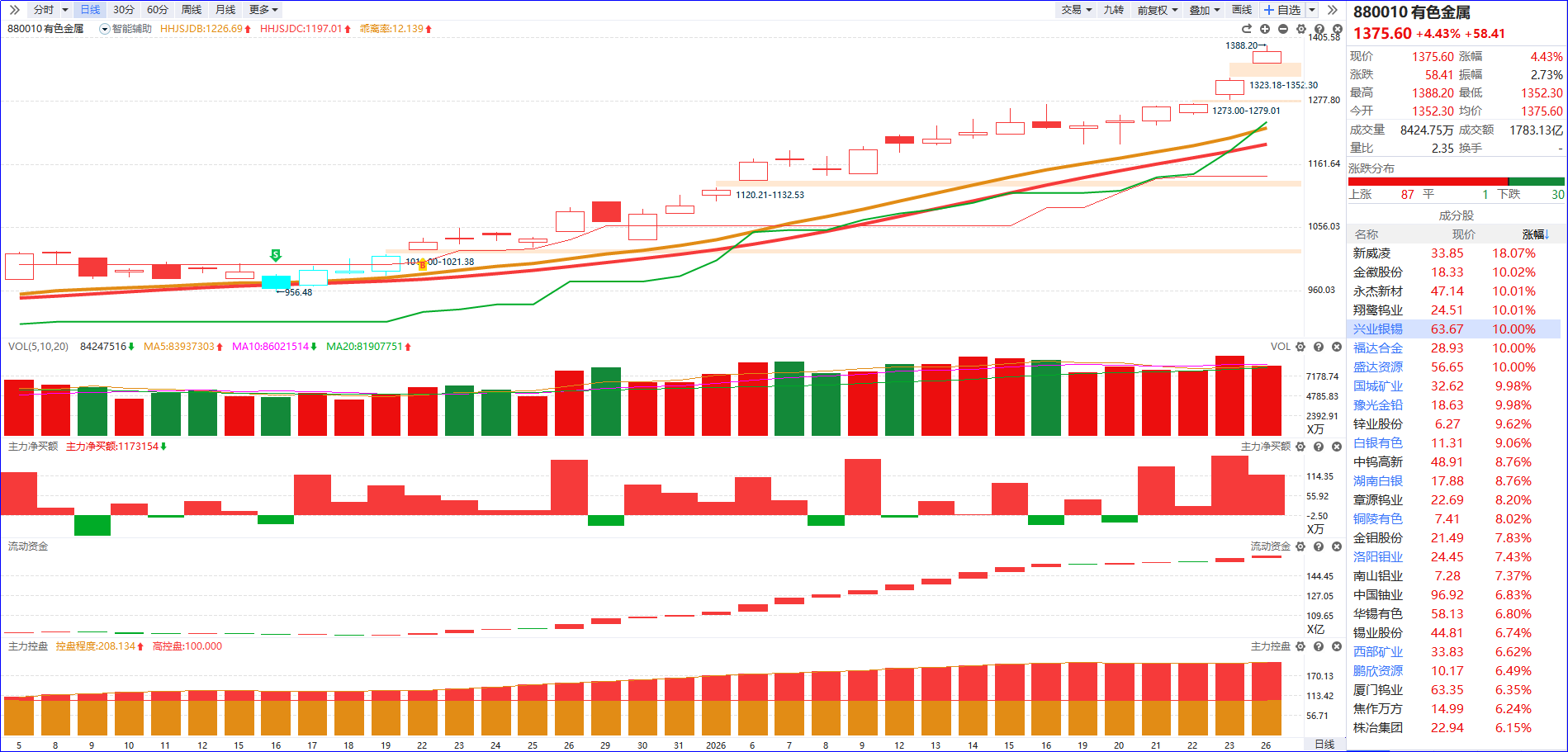 从软件信号看,有色金属近期表现强势,流动资金持续翻红,主力净买额红肥绿瘦,资金做多意愿明确。此前板块整体以震荡上行趋势为主,今日相关个股开启加速上涨,这一态势或进一步加剧短线波动幅度。从筹码与控盘角度看,板块整体处于高控盘状态且控盘递增,内部涌现出一批主力高控盘、筹码锁仓充分且股价突破历史新高的标的。对于此类高控盘个股,只要未出现放量大阴线,就尚未释放明确的风险信号。