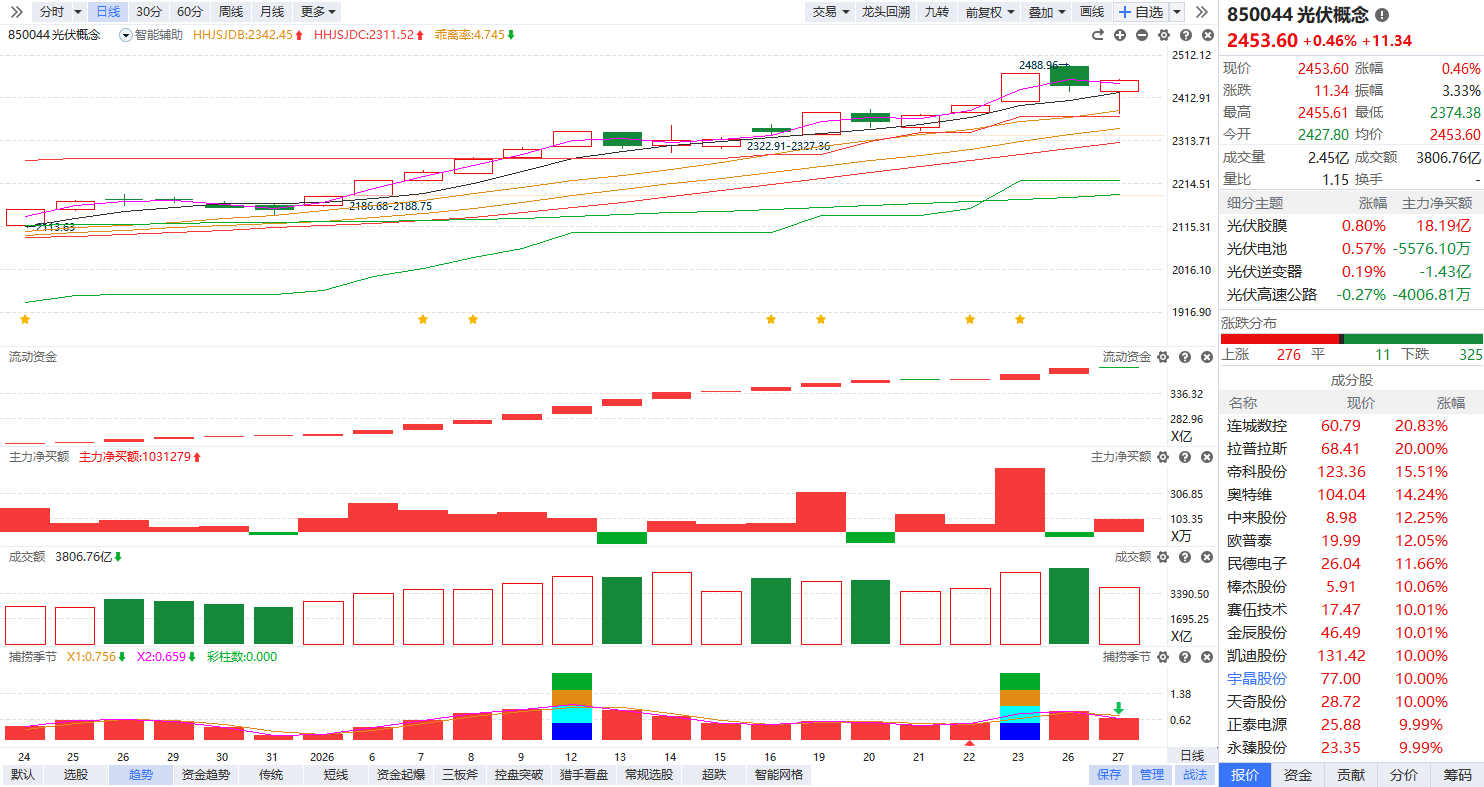 午后太空光伏概念持续回升,拉普拉斯、中来股份涨超10%,宇晶股份、赛伍技术触及涨停,此前拓日新能3连板,连城数控、帝科股份、迈为股份、金辰股份跟涨。
