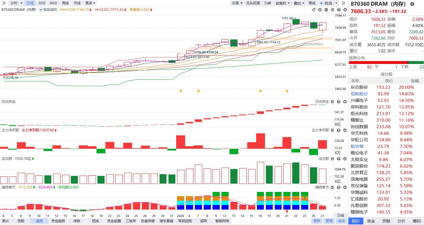 根据软件信号,板块近期流动资金持续翻红,主力净买额红肥绿瘦,资金强势背景下放量突破横盘平台。目前捕捞季节死叉震荡,短线容易出现内部分化,耐心等待死叉3-4个交易日后的回档节点,如能走出回档金叉,有望在资金强势背景下开启新一轮上升趋势。