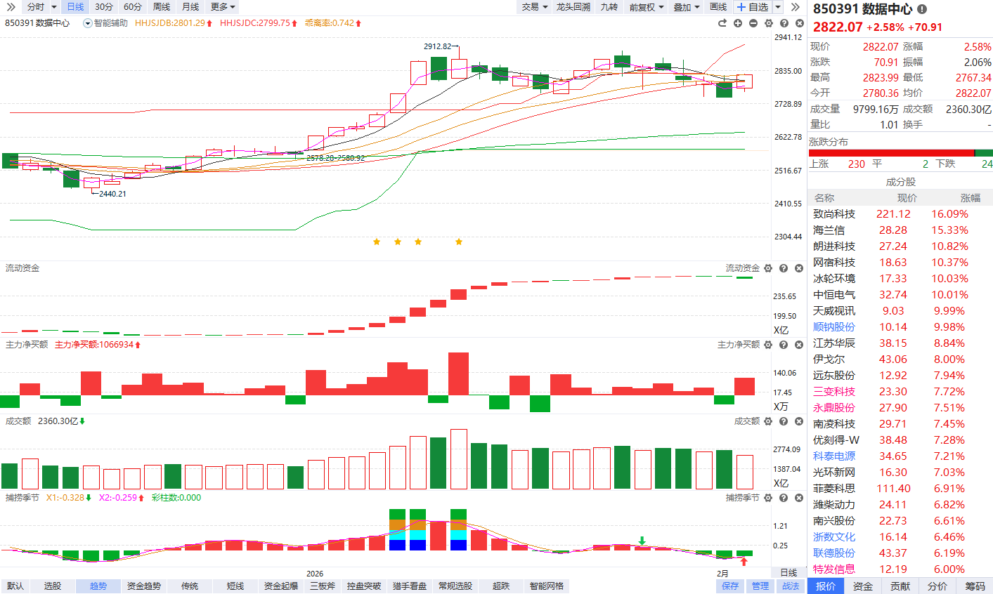 根据软件信号,板块近期流动资金持续翻绿且已经跌破辅助线,短线在消息刺激下局部异动反抽,不具备太强的持续性,后续需要流动资金快速翻红站上辅助线,迎来资金和趋势拐点,才有望形成新一轮持续性上攻。