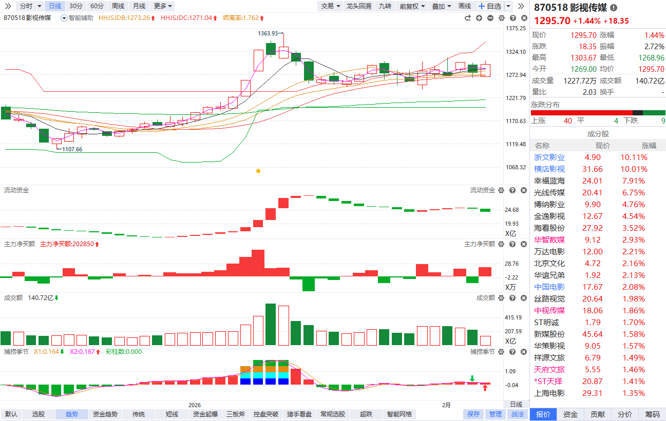 早盘影视板块再度走强,横店影视6天5板,浙文影业涨停,幸福蓝海、博纳影业、金逸影视、中国电影跟涨。