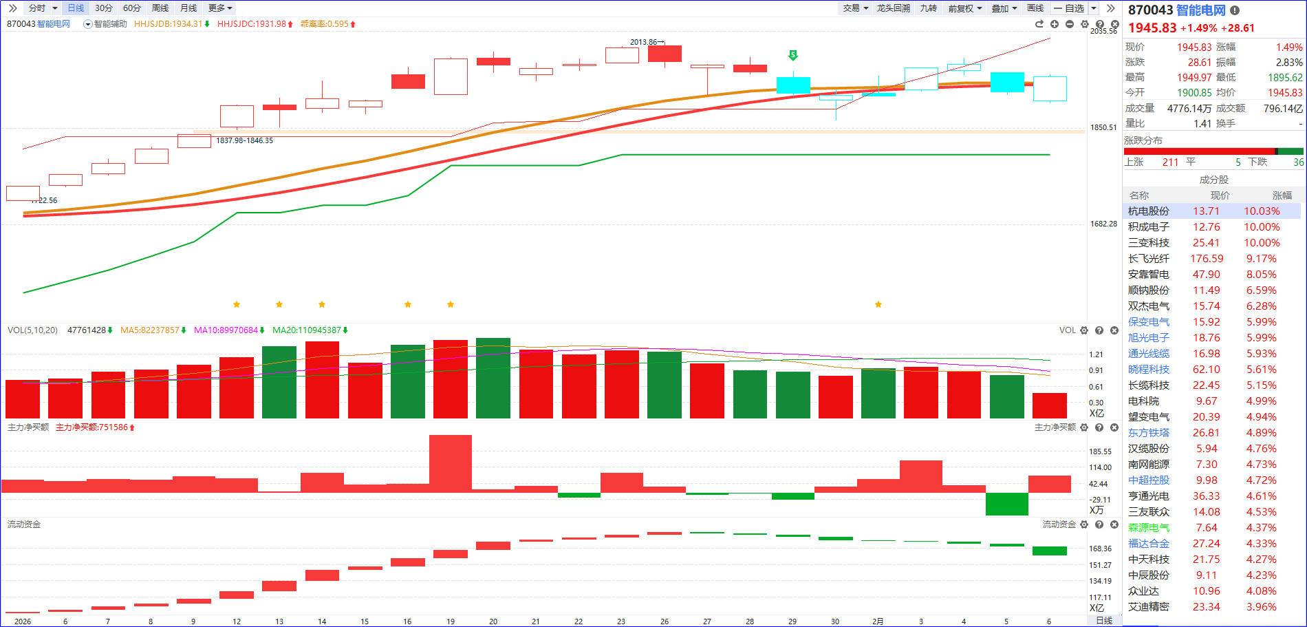 从软件信号看,智能电网概念近期流动资金持续翻绿,主力净买额红肥绿瘦,K线围绕智能辅助线维持震荡整理态势。短期操作思路以波段布局为主,关注5日主力排序靠前、流动资金持续翻红的标的,把握震荡行情中的波段机会。