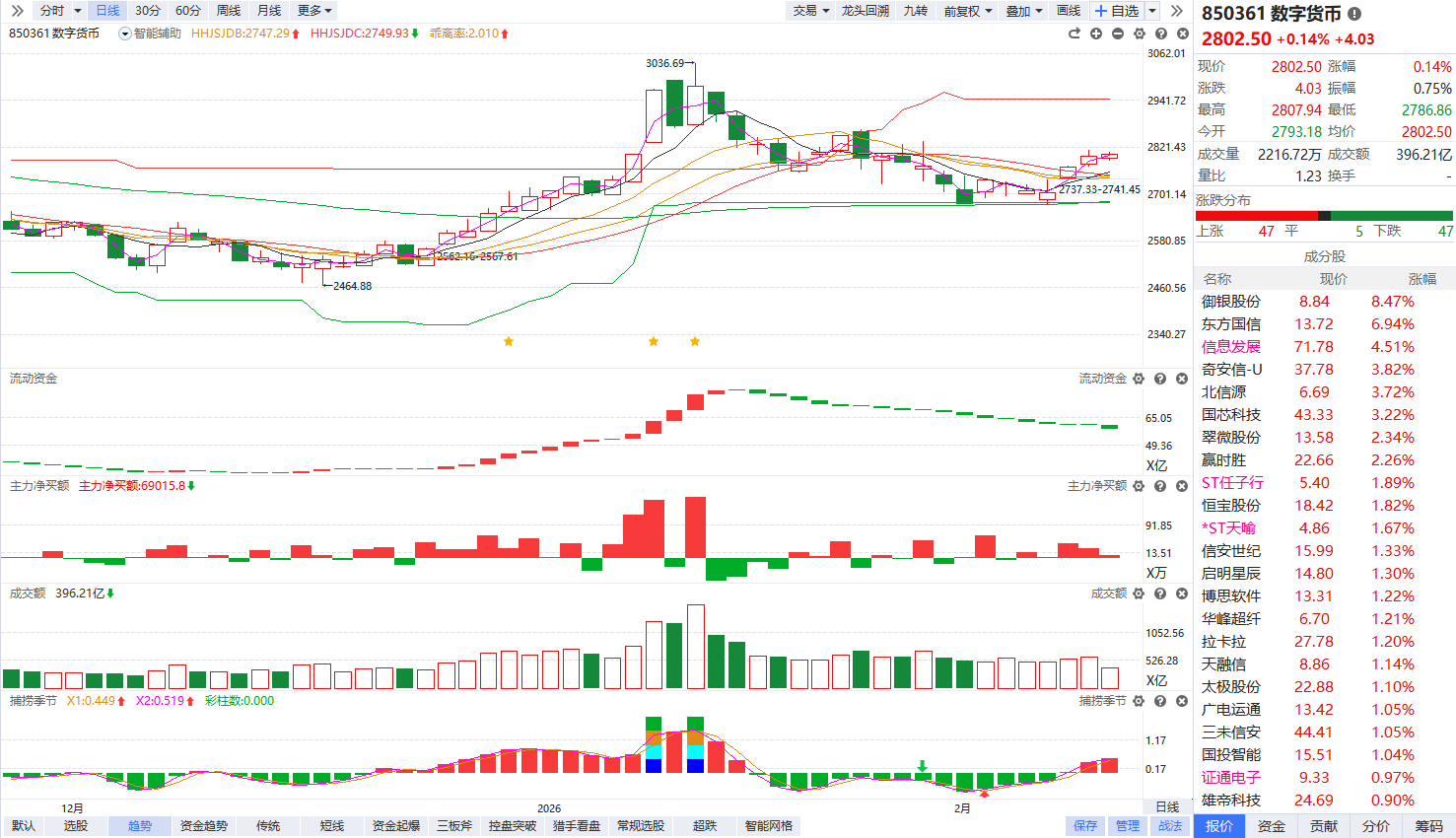 根据软件信号,板块近期流动资金持续翻绿,主力净买额红肥绿瘦,资金弱势背景下回档金叉站上辅助线,反弹暂时只是利好刺激下的局部活跃,后续如果流动资金不能快速翻红走强,缺少增量资金入场承接,就仍容易再次分化,注意回避冲高追涨,耐心等待流动资金翻红转强,以及周线金叉的趋势拐点信号出现。