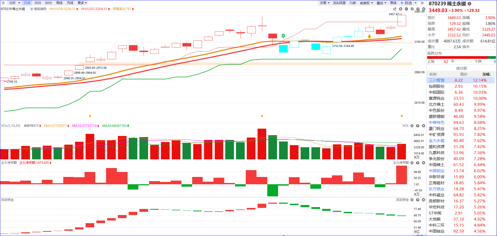 从软件信号看,稀土永磁近期流动资金持续翻绿,主力净买额红肥绿瘦,K线走势整体震荡向上。结合流动资金持续翻绿的表现,板块内部偏向结构性行情,后续操作需重点聚焦5日主力排序靠前、主力控盘程度稳步递增的个股。
