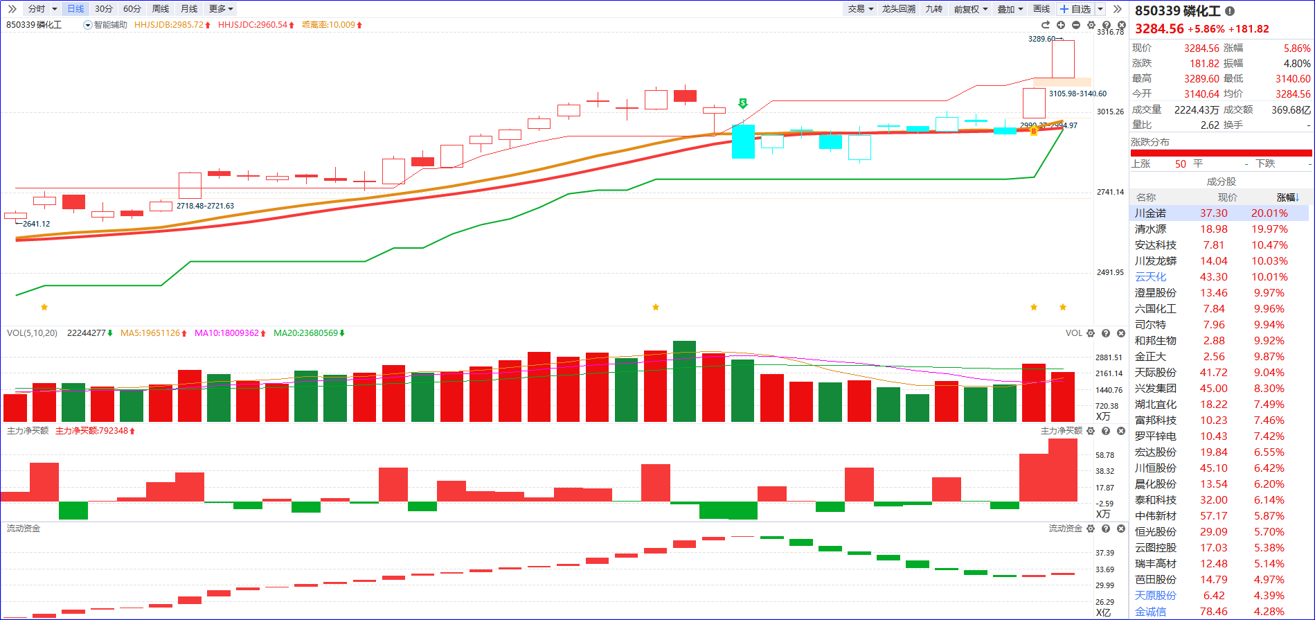 从软件信号看,磷化工板块近期流动资金持续翻红,主力净买额红肥绿瘦,K线整体上升态势。板块资金与趋势向好,今日涨停家数位于市场前列,后续操作需重点聚焦5日主力排序靠前、流动资金持续翻红,主力控盘程度稳步递增,且受益于产品涨价逻辑的个股。