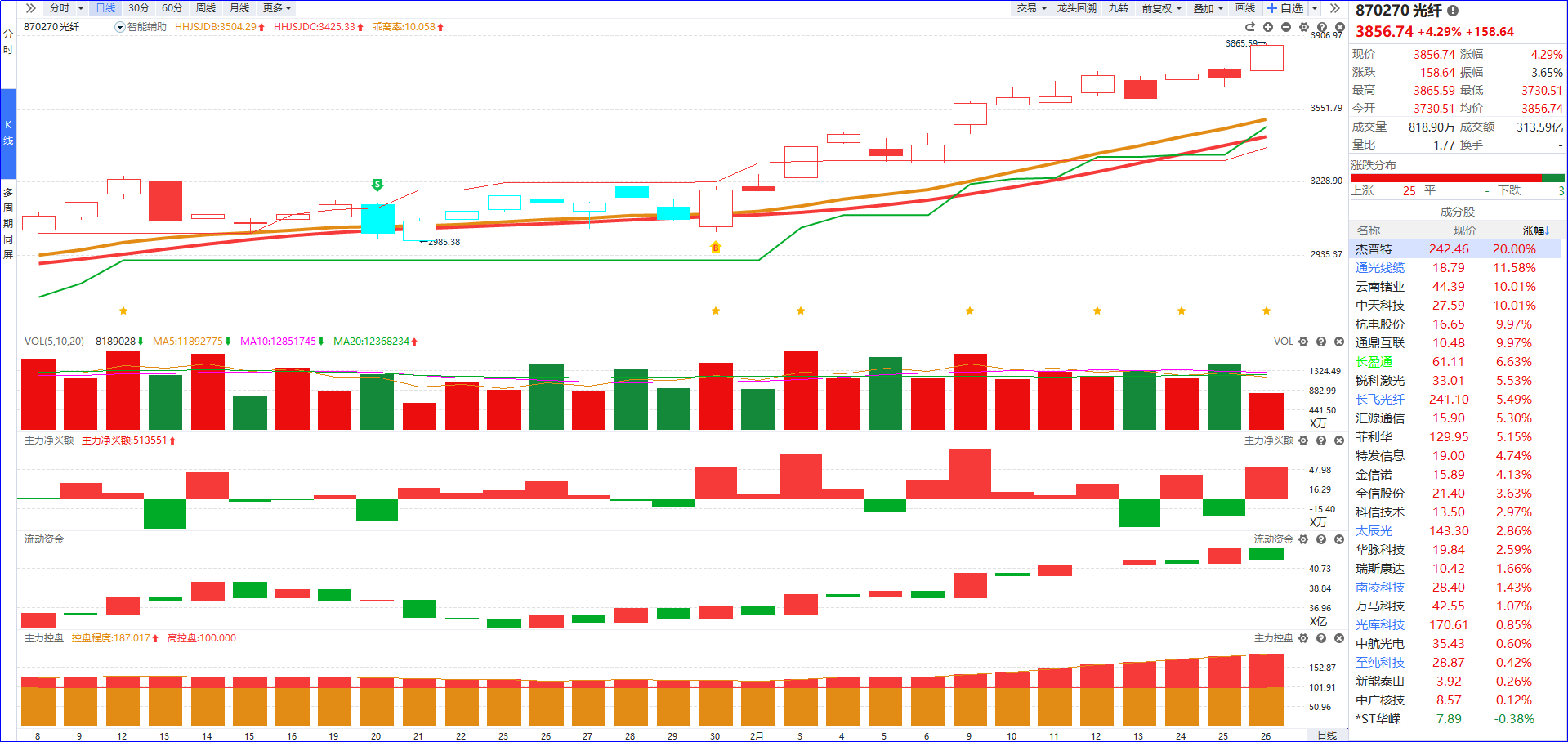 从软件信号看,光纤概念近期流动资金翻红向上,主力净买额红肥绿瘦,K线走势与资金趋势形成共振,短期向好态势明确。结合当前市场主线,涨价逻辑持续主导盘面,光纤作为AI产业链相关通胀品,受到资金重点追捧,板块高控盘程度呈现逐步递增态势。布局方面,重点关注板块内5日主力资金排序靠前、流动资金持续翻红的标的,优先筛选主力高控盘个股作为中线跟踪方向,把握趋势性机会。