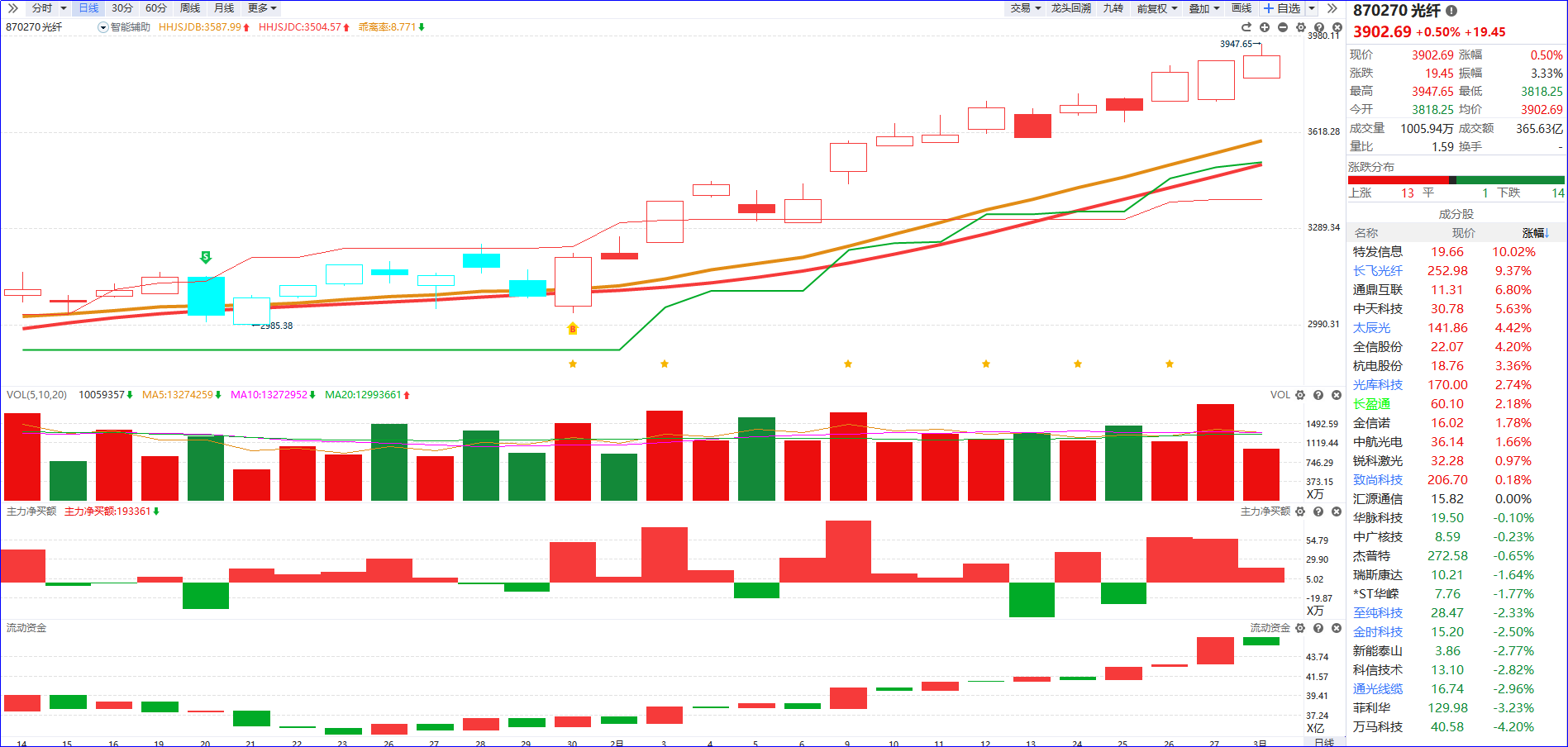 从软件信号看,光纤近期流动资金持续翻红,主力净买额红肥绿瘦,K线走势稳步上行,明确呈现上升趋势。短期市场偏好涨价主线,而光纤作为AI产业链相关通胀品种,凭借其产业链关联性优势,持续受到资金重点追捧。操作上,重点关注板块内5日主力资金排序靠前、流动资金维持持续翻红的标的,同时优先筛选主力高控盘个股,作为中线跟踪核心方向,把握趋势性机会。