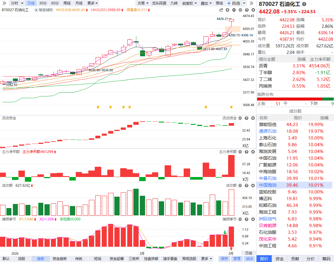 根据软件信号,板块近期流动资金持续翻红,主力净买额红肥绿瘦,回档金叉站后温和放量突破平台,如果后续资金持续翻红走强,有望延续震荡上行趋势,可以积极关注日线金叉波段中的60分钟回档博弈。