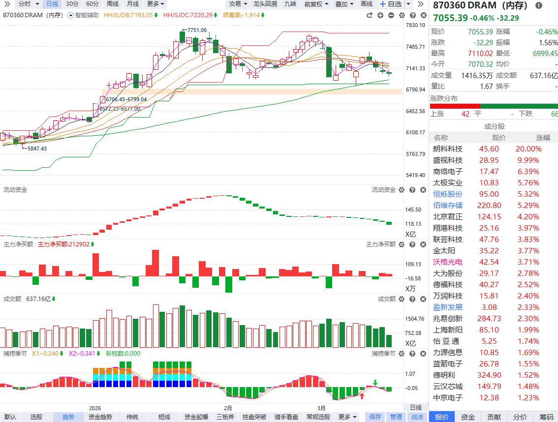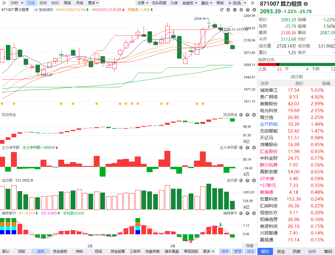根据软件信号,板块近期流动资金开始翻绿,主力净买额红肥绿瘦,目前资金活跃度开始降低,且趋势跌破辅助线支撑进入弱势震荡区间,短线注意回避冲高追涨,对于板块内的趋势走弱破位的个股注意及时切换。
