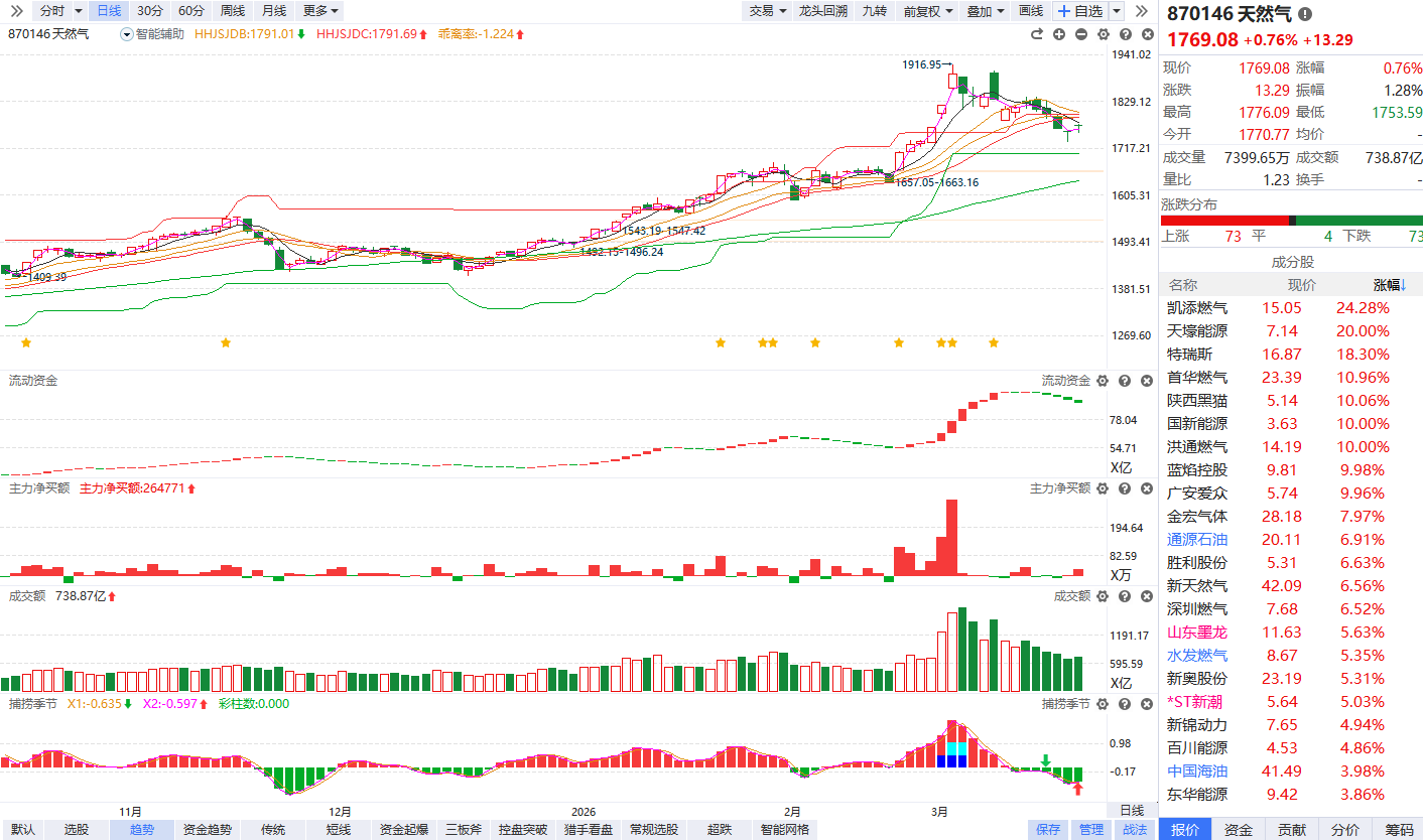 午后天然气板块持续走高,蓝焰控股涨停,此前国新能源涨停,凯添燃气涨超20%,天壕能源、特瑞斯、首华燃气、新天然气、深圳燃气、新奥股份等涨幅靠前。