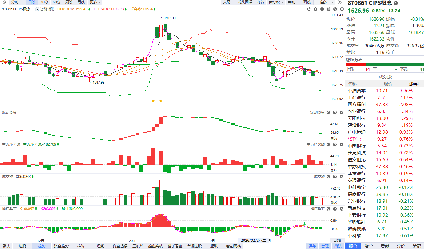 根据软件信号,板块近期流动资金持续翻绿创新低,主力净买额红肥绿瘦,目前已经跌破辅助线进入弱势震荡区间,短线反抽遇到辅助线压力容易再次分化,耐心等待捕捞季节底背离金叉后重新站上辅助线的趋势拐点。
