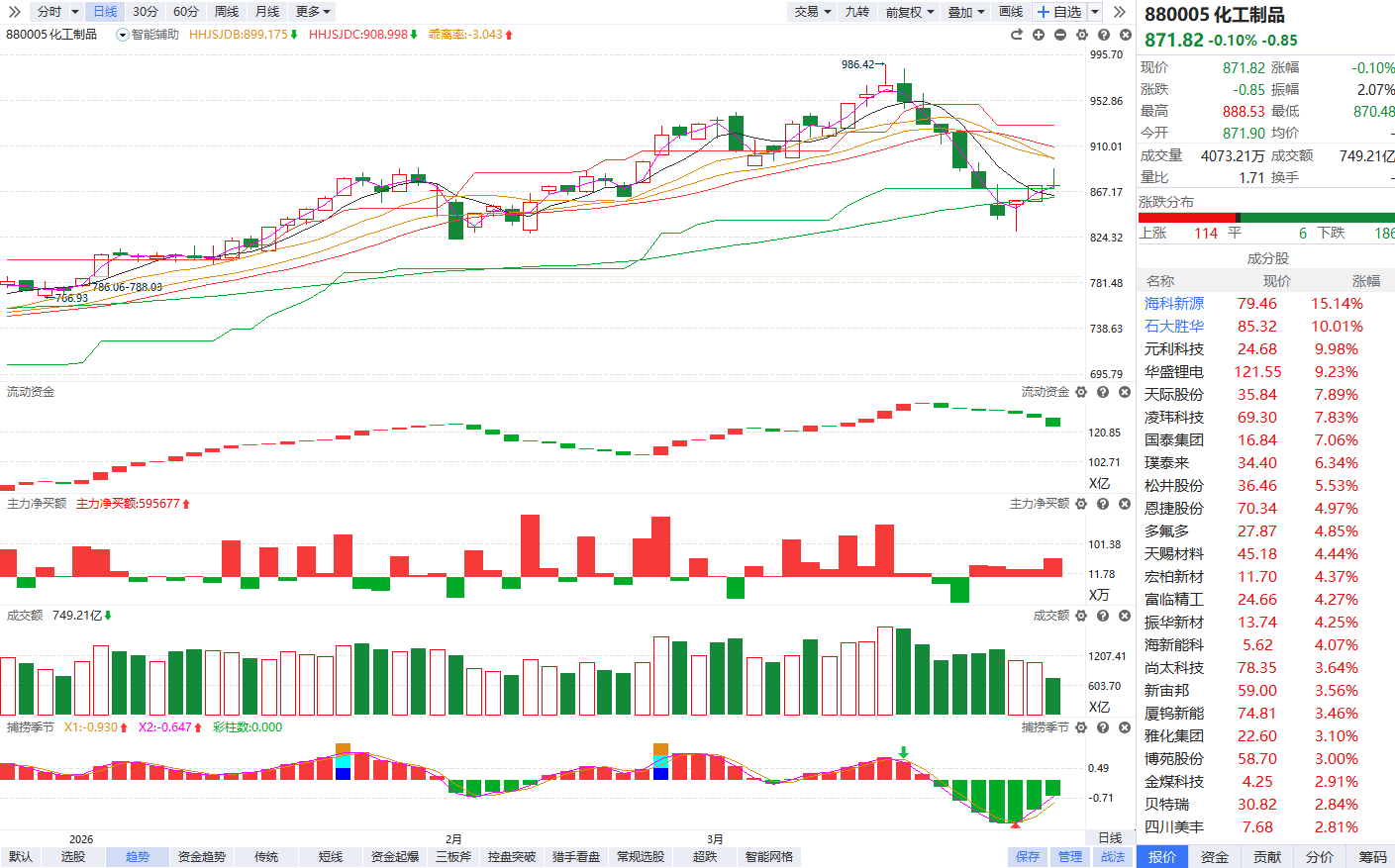 根据软件信号,板块近期流动资金持续翻绿,主力净买额红肥绿瘦,短线超跌反弹到辅助线压力附近冲高回落分化,如果缺少增量资金承接获利盘,容易形成二次探底,需要耐心等待二次回踩确认支撑有效且流动资金开始翻红后,再考虑博弈回档机会。