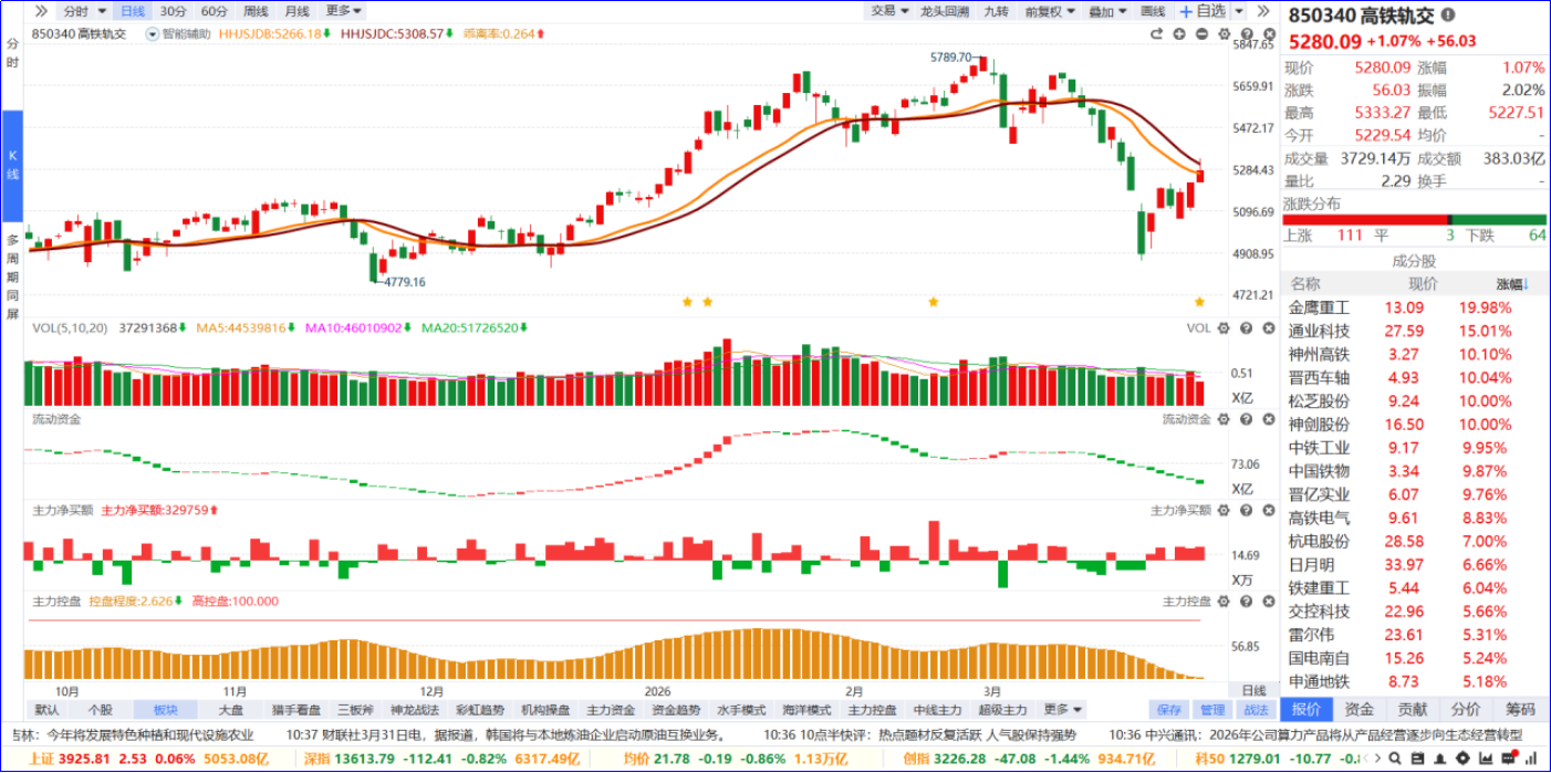 从软件信号看,高铁轨交概念近期流动资金持续翻绿,主力净买额红肥绿瘦。从炒作逻辑看,沿江高铁5000亿超级工程落地,叠加基建稳增长与交通强国战略,带动全产业链需求爆发,核心装备与原材料订单确定性高。从K线走势看,板块高位回调后逐步修复,今日温和上涨,个股涨跌分化明显,涨停家数居市场第一位。后续可聚焦5日主力资金排序靠前、流动资金翻红且部分具备核心技术壁垒的标的跟踪。