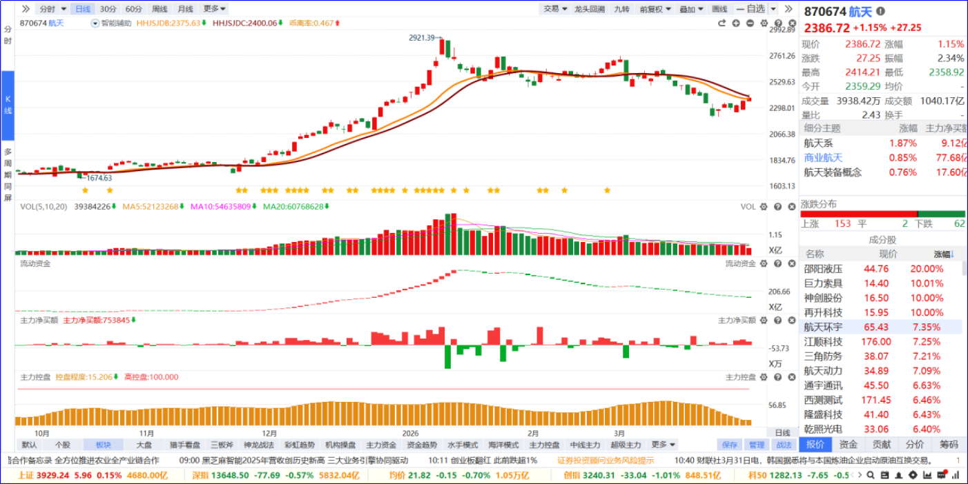 从软件信号看,航天板块近期流动资金持续翻绿,主力净买额红肥绿瘦。从炒作逻辑看,板块受益于力箭二号火箭成功发射的产业落地催化,叠加国防现代化刚需与商业航天长期成长空间,政策与事件双重驱动。从K线走势看,板块高位回调后逐步修复,今日温和上涨突破智能辅助线,个股分化明显,多只标的涨停。后续可聚焦5日主力资金排序靠前、流动资金翻红的个股,等待回踩支撑企稳后再布局。