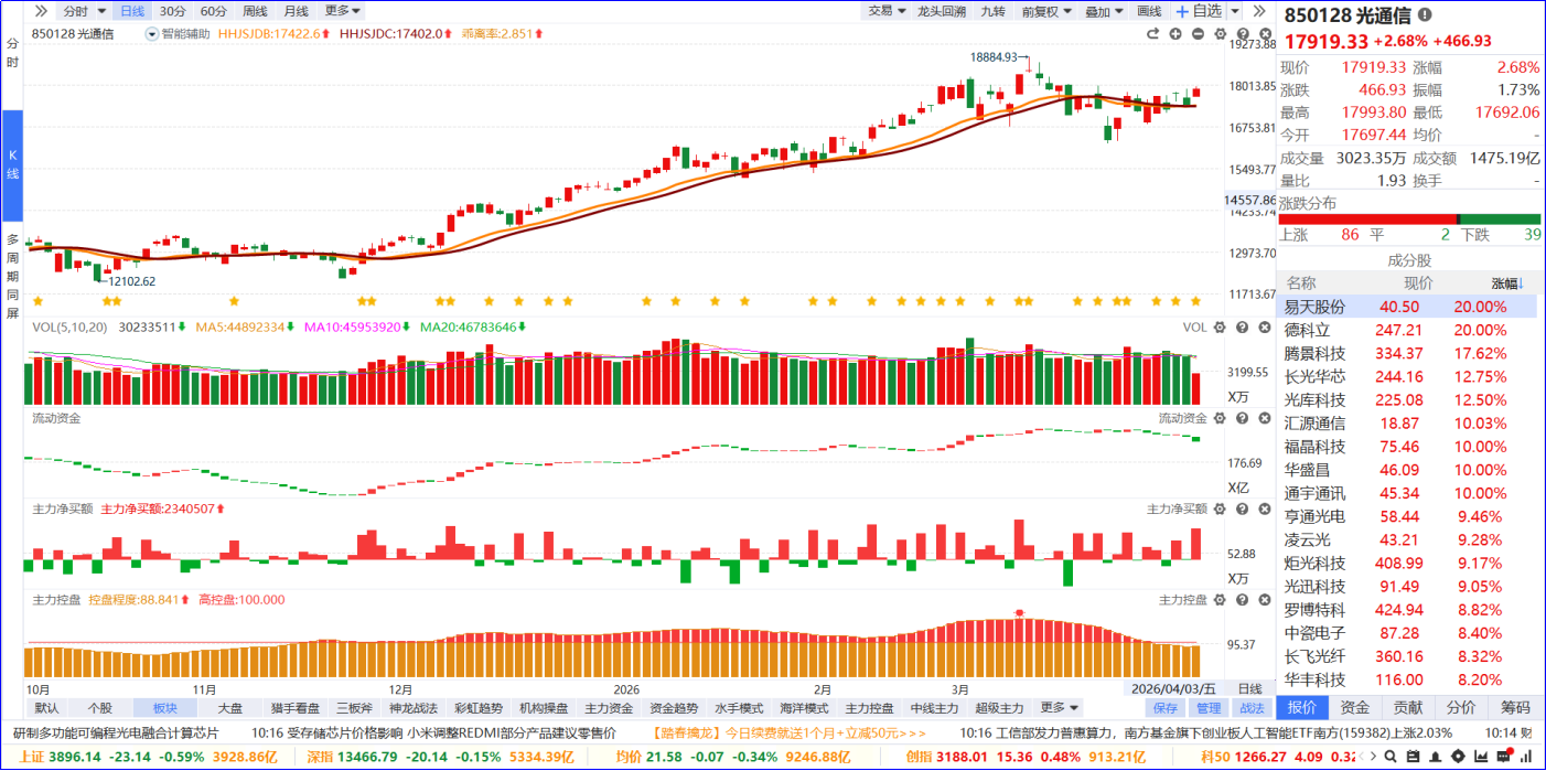 从软件信号看,光通信板块近期流动资金持续翻绿,主力净买额红肥绿瘦。从炒作逻辑看,核心是工信部算力政策落地,推动全光交换技术部署,为算力银行、算力超市提供低时延网络支撑,叠加AI算力需求爆发。从K线走势看,板块高位震荡后修复,今日放量上涨,涨停家数居市场第一位。后后续可重点关注两类个股:一是5日主力资金排序靠前、处于低位且流动资金持续翻红的标的;二是处于相对高位,但筹码控盘程度持续递增的个股。